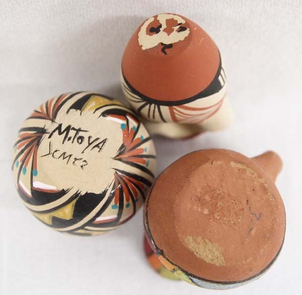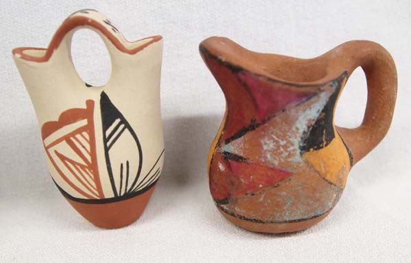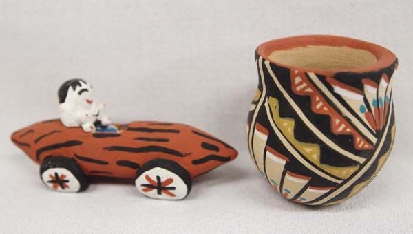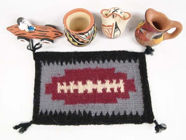 Native American Pueblo Pottery and Mini Weaving, textile weaving measures 4'' x 6'', #1 Navajo Sampler Rug, 4 cornered tassels #2 Jemez Jar signed M. Toya #3 Vintage Jemez Poster Paint Pitcher #4 Jemez Wedding Vase #5 Jemez Pottery Car and Driver