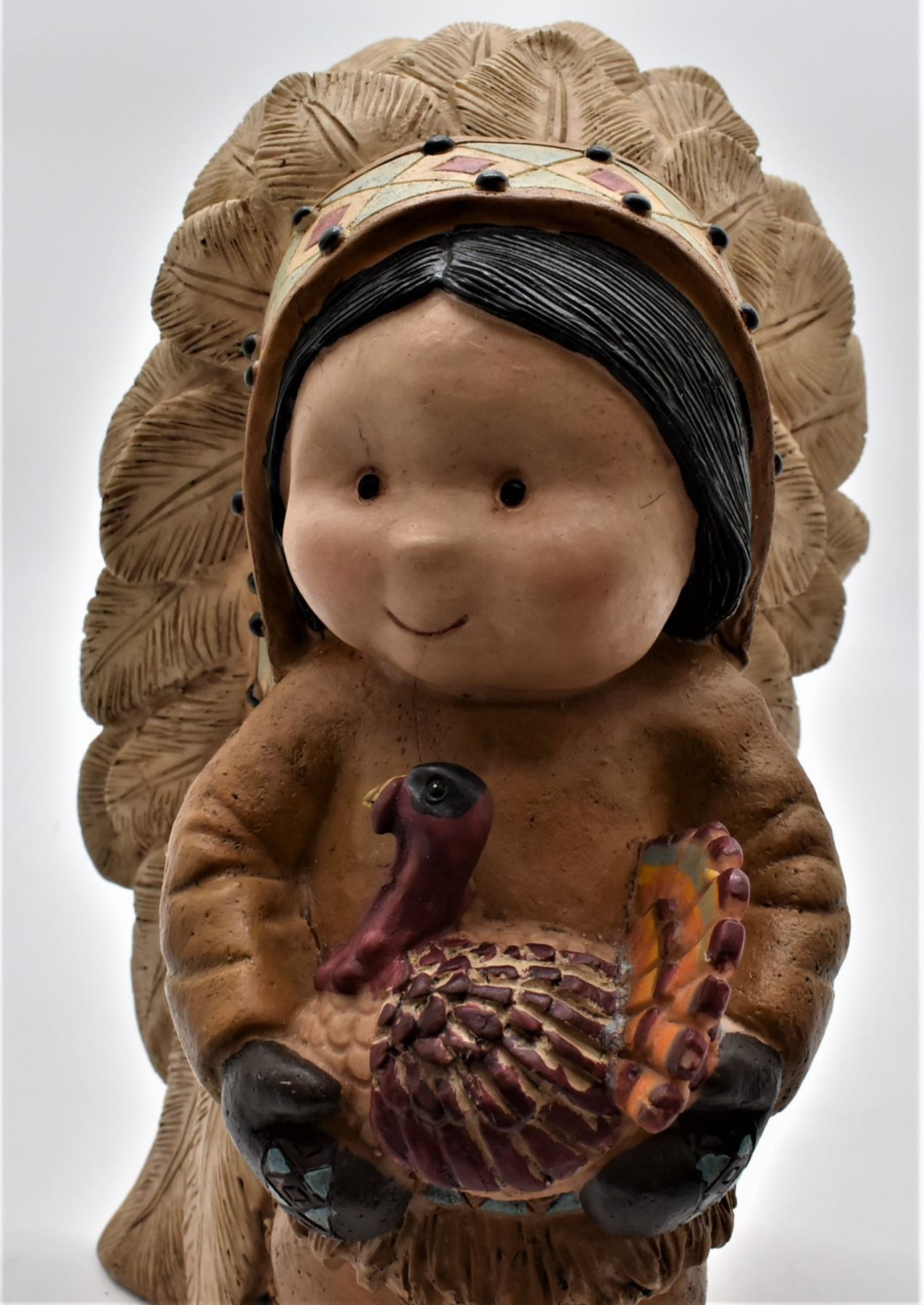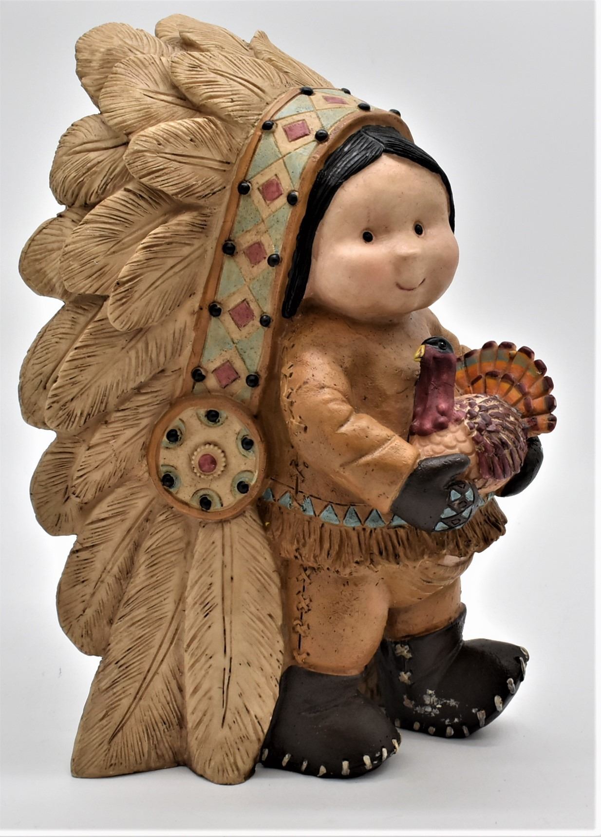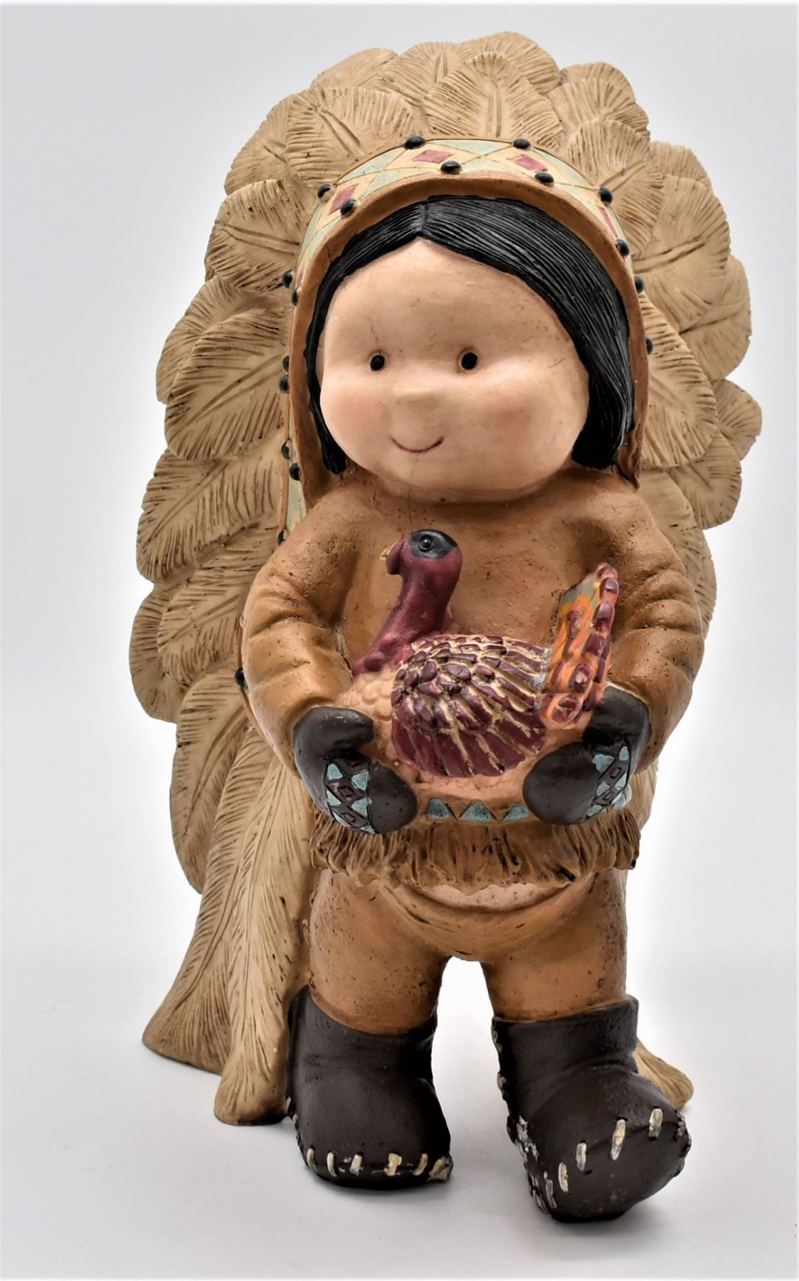 Native American Resin Chieftain Boy Figurine, meticulously decorated and painted figurine of a young Indian boy in ''Chieftain'' headdress and clothing, he has a sweet naive face, now late for Thanksgiving andpresenting hs ''Christmas Turkey'', Who could resist this charmer?, molded poly-resing material, standing 11''H x 7'' x 8''