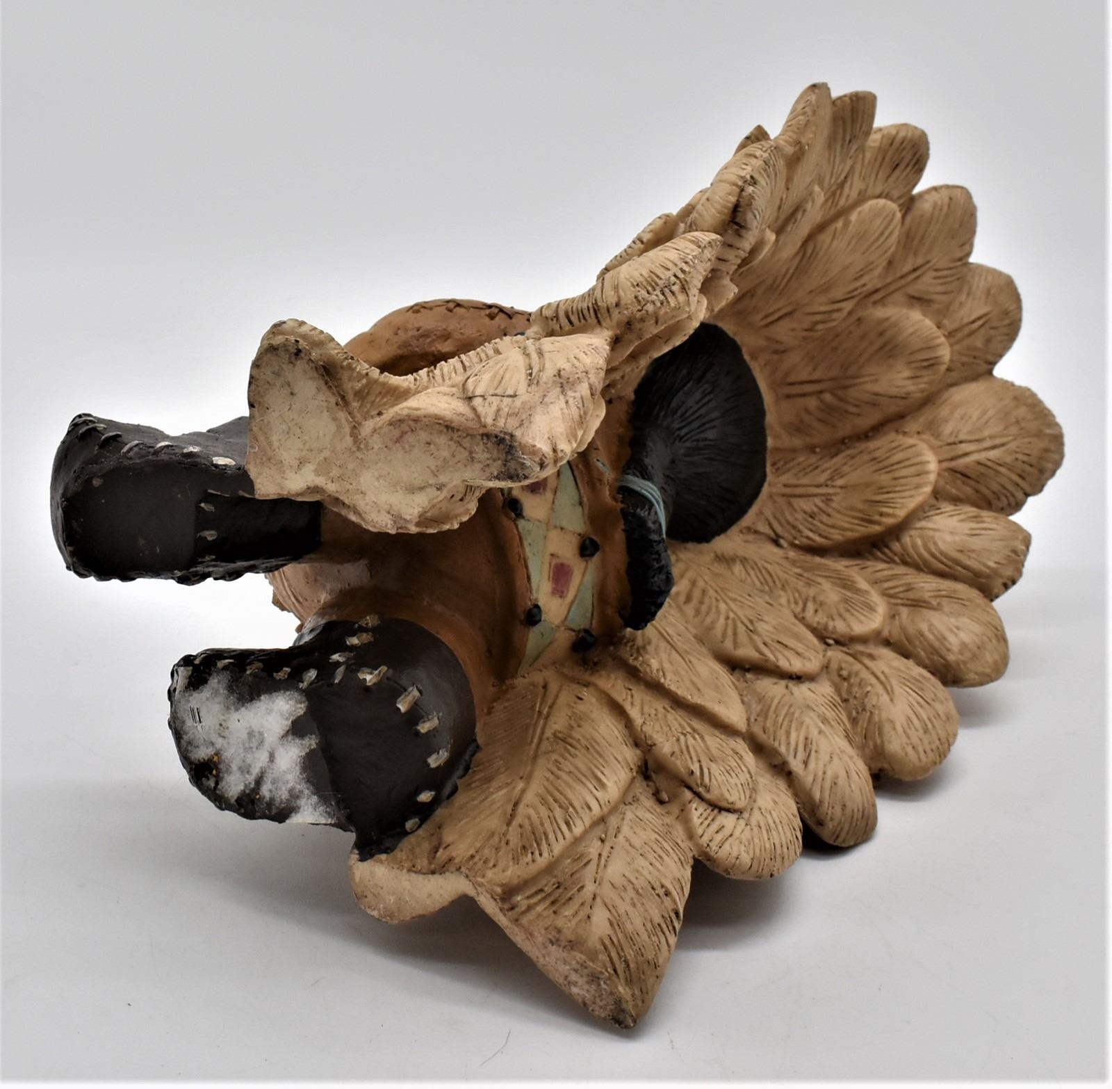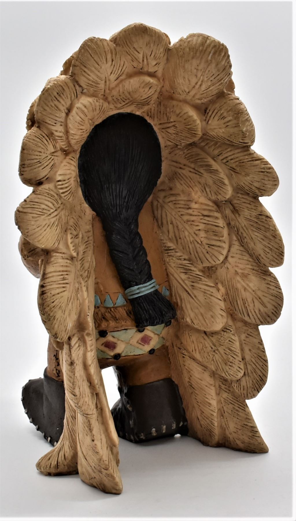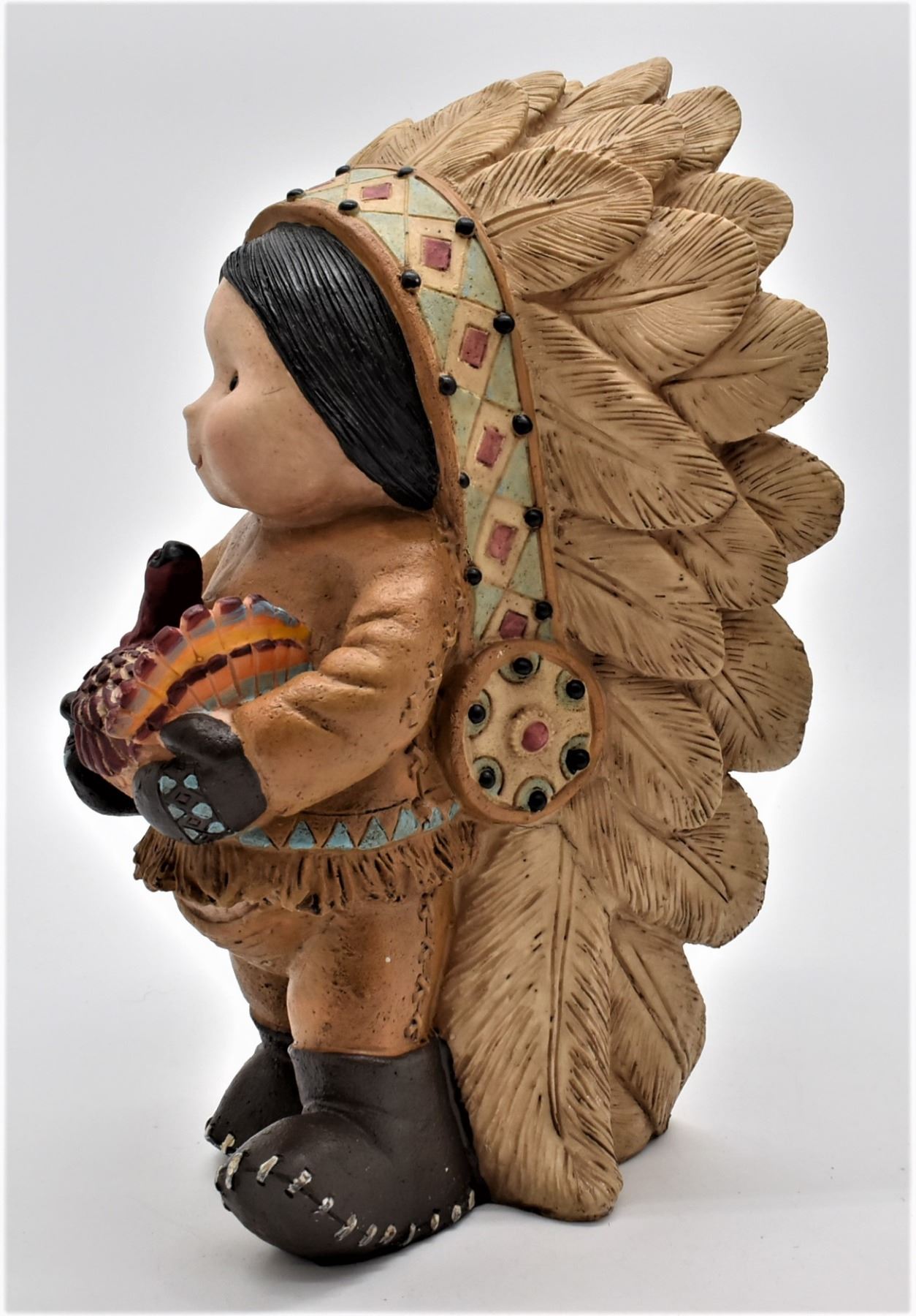 Native American Resin Chieftain Boy Figurine, meticulously decorated and painted figurine of a young Indian boy in ''Chieftain'' headdress and clothing, he has a sweet naive face, now late for Thanksgiving andpresenting hs ''Christmas Turkey'', Who could resist this charmer?, molded poly-resing material, standing 11''H x 7'' x 8''