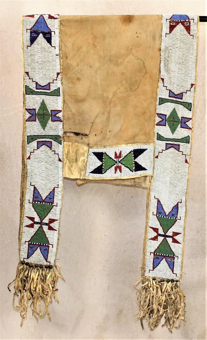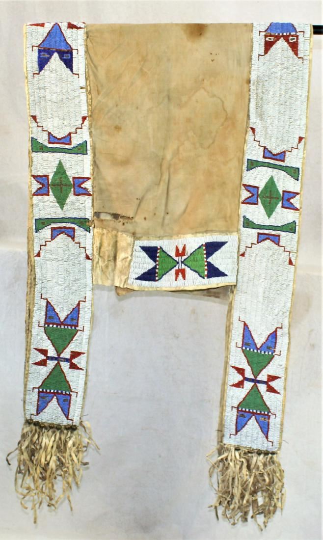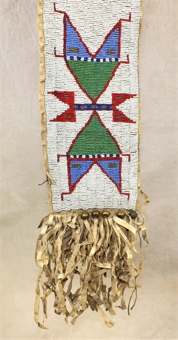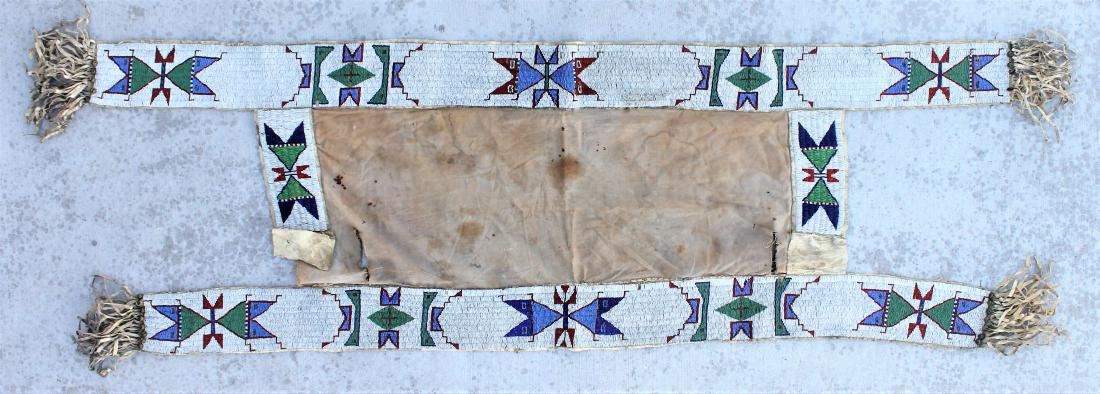 Outstanding Plains Indian saddle blanket with wide geometrically beaded strips lining the perimeter, using early red, two colors of blue and green, accented by fantastic fringe and brass hawk bells, with canvas center backing.