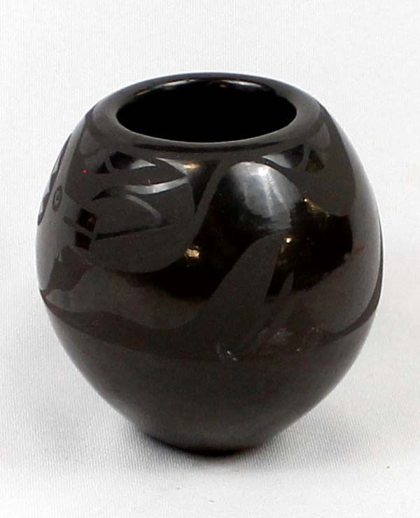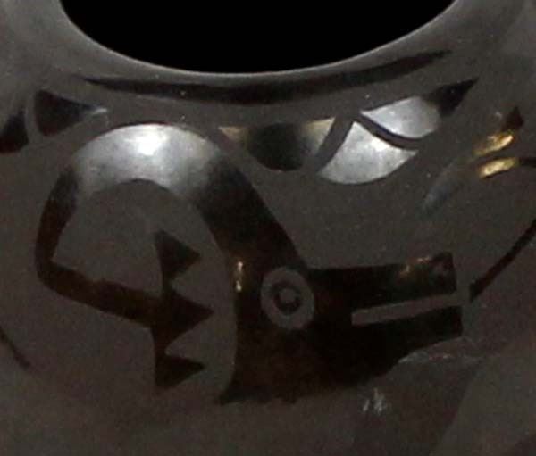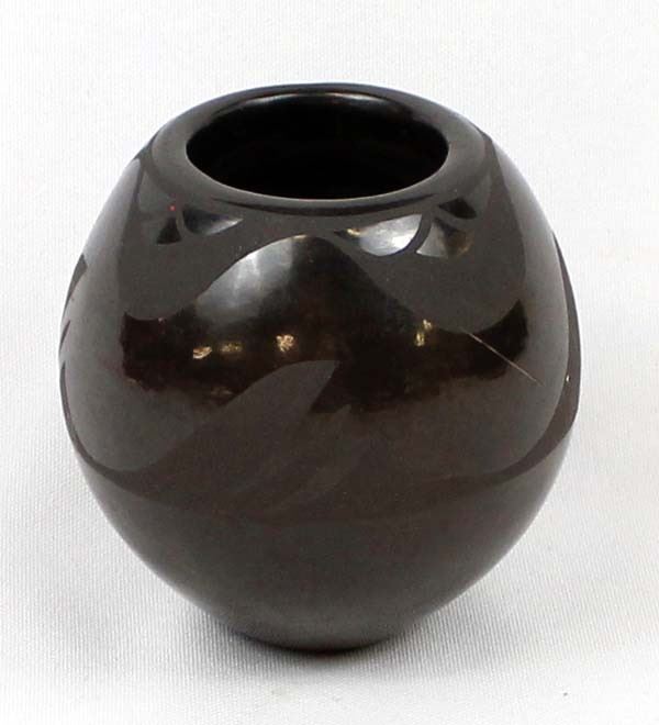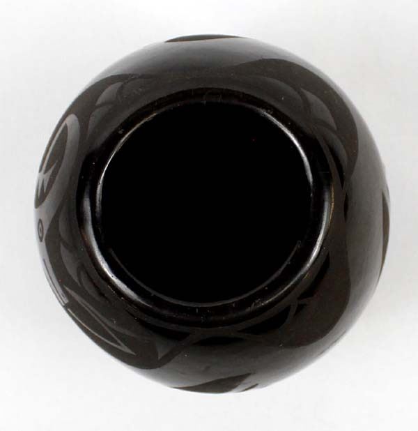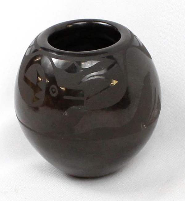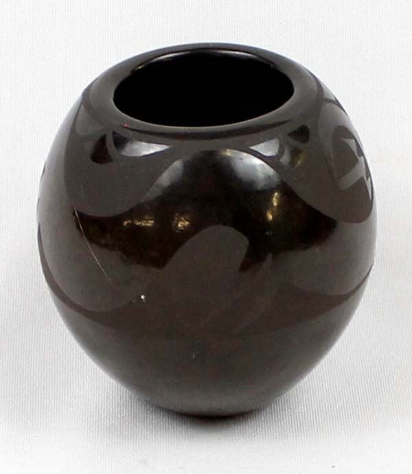 Native American Santa Clara Avanyu Pottery Jar by Jerry Sisneros, has a 1'' scratch on body, Hardly noticeable. 3'' x 3''. Signed on the bottom.