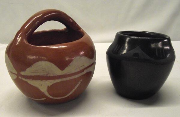 2 Native American Santa Clara Pottery. The black pot is sign on the bottom Peggy Tafoya. Largest pot measures approx. 4''H x 4 1/4''W. Buyers Pay Actual Shipping and Handling Charges(see terms and conditions for more information).