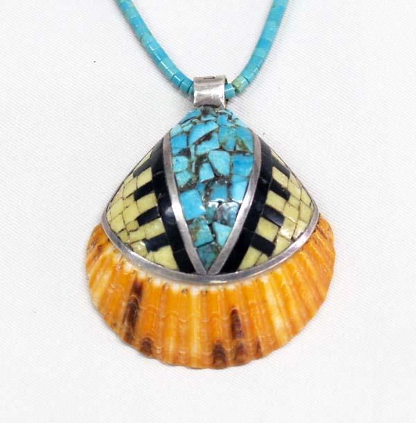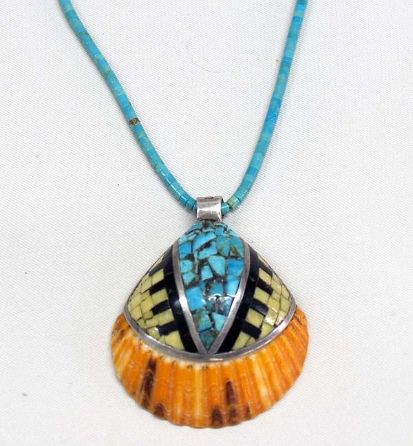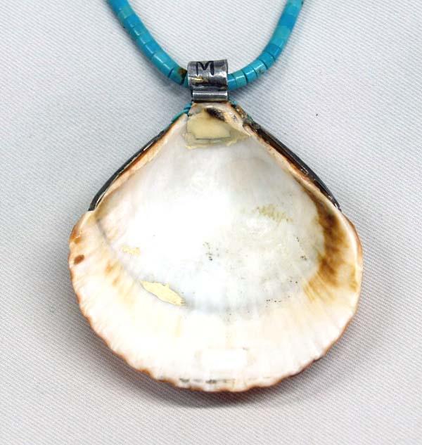 Native American Santo Domingo Inlay Shell Necklace, Chip Inlay Turquoise, Jet and Serpentine, Turquoise Heishi Beads, String Tied, Silver Bale Hallmarked EM, measures approx. 17.5'' end to end and shell pendant 2 1/8'' x 2.5''. Buyers Pay Actual Shipping and Handling Charges(see terms and conditions for more information)