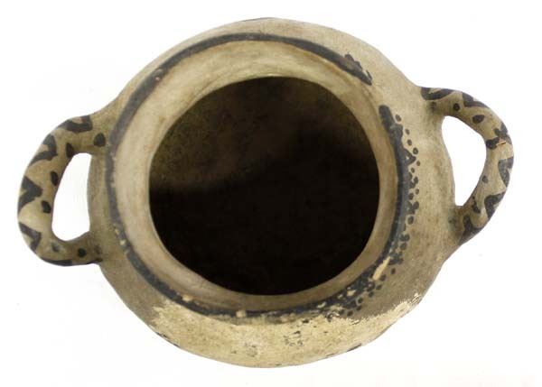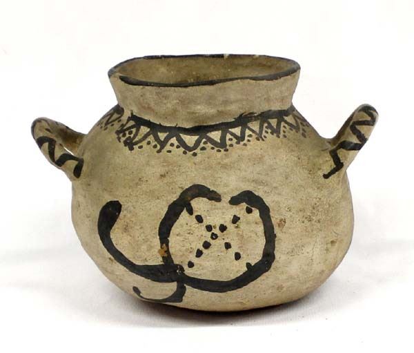 Early Native American Santo Domingo Pottery by Santana Melchor, measures 5'' x 7'' x 6'', signed in pencil on the bottom, double handled, FYI: ''Santana Melchor (1889-1978) was considered one of the finest potters at Kewa Pueblo (Santo Domingo) in the early- and mid-20th century.''