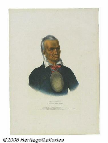 <B>Native American Seneca War Chief "Red Jacket" Wearing His George Washington Peace Medal</B></I> Two items regarding Seneca war chief Red Jacket. One is a lithograph and the second a folio 13-page biography. McKinney & Hall lithograph 1837, <I>Red-Jacket/A Seneca War Chief,</B></I> published by E. C. Biddle, Philadelphia, Pennsylvania. Choice, extremely fine. Large 20" x 14.25" folio color lithograph of the famous Seneca Indian Chief Red Jacket, wearing his large silver oval 1792 George Washington Peace Medal. Large print, with minor soiling along the wide margins, disbound from McKinney & Hall's <I>History of the Indian Tribes of North America.</B></I> This litho was <I>"Printed & Coloured at I. T. Bowen's Lithographic Establishment/Entered according to act of Congress in the year 1837...."</B></I> Red Jacket was the important Seneca Indian Chief who received a 1792 Peace Medal from George Washington. His medal is one of the extremely rare large oval silver versions especially produced for the government, being hand-engraved in silver by silversmith Joseph Richardson of Philadelphia and having his personal silversmith's punch mark. This very medal is one of the few large Silver Indian Peace Medals with an uninterrupted pedigree. Although proud of his Peace Medal, Red Jacket pawned it off once while he was drunk. A benefactor recognized the medal and its importance, redeemed the medal and returned it to Red Jacket. The medal still exists today, and was used to illustrate both the Belden and Prucha works. Red Jacket is portrayed in a blue jacket with gold buttons, a white shirt, and a red scarf; the huge Peace Medal is held by a blue ribbon. This beautiful and extremely historic print would make an important addition to any collection of Indian Peace Medals and illustrates one of the most famous recipients. A well-known West Coast American auction house sold one of these prints for $3,450 in their December 11, 1999 auction, and another at $4,800 in December of 2001. The print is also accompanied by the original large folio, 13-page biography of Red Jacket, also from McKinney and Hall's <I>History of the Indian Tribes of North America...,</B></I> 20" x 14 1/2", which is very fine, with scattered foxing. A footnote mentions that Red Jacket normally dressed only in his tribal costume, but made an exception when he sat for the painting by C. B. King, from which this print is made. Lot:251
