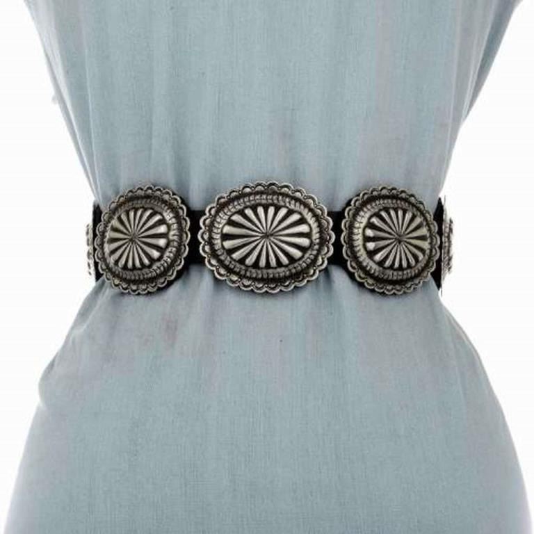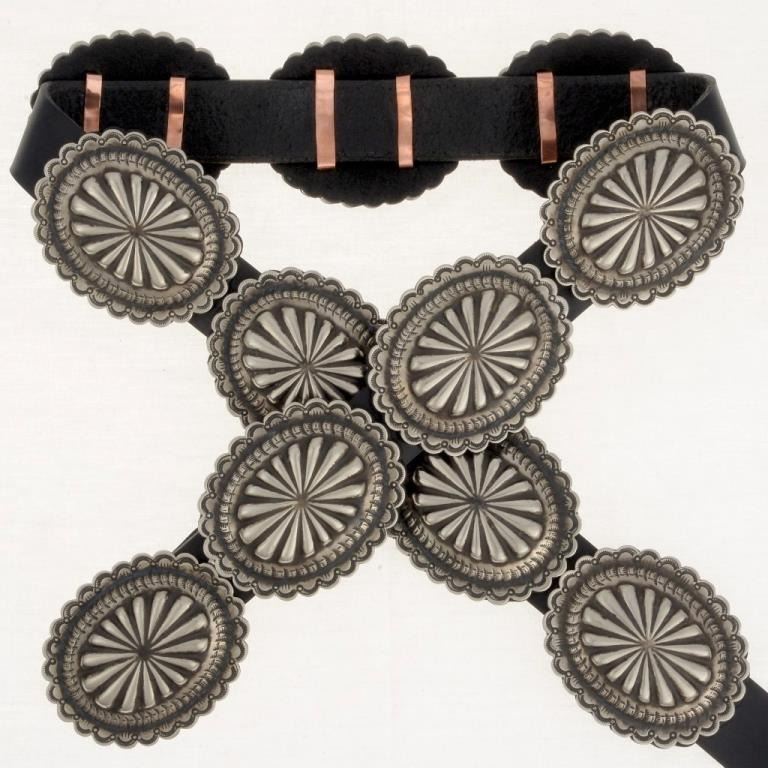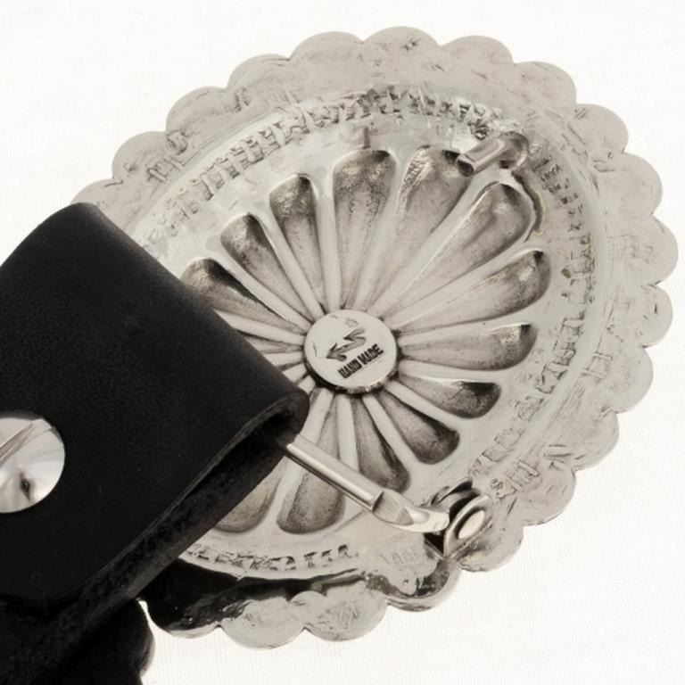 Hammered and antiqued German Silver 3” x 2-1/2" ovals on unpunched black leather. Stamped Handmade and hallmarked by Navajo Joey McCray.