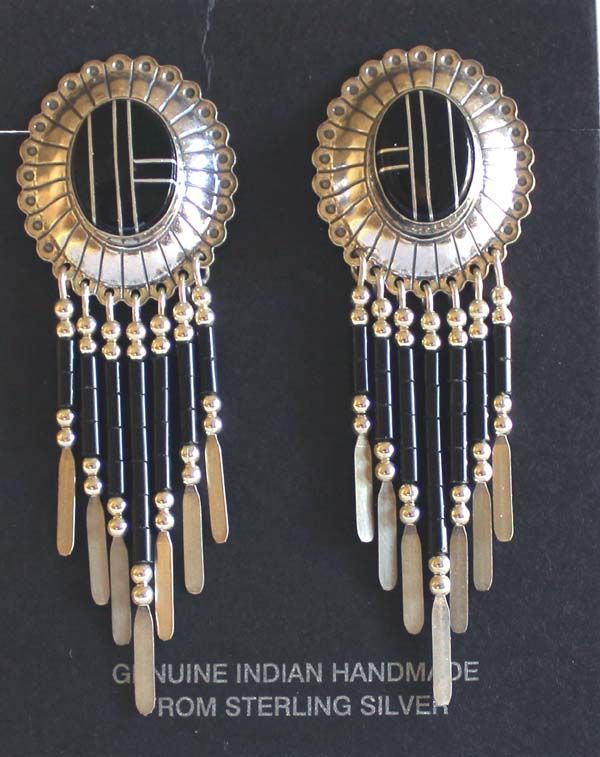 Native American Sterling Onyx Concho Dangle Earrings, hallmarked QT which is a shop hallmark for Q.T. Quoc Turquoise, Inc., Albuquerque, measure 2.75''L x 7/8''W, stamped conchos, 10.51g in total wt.