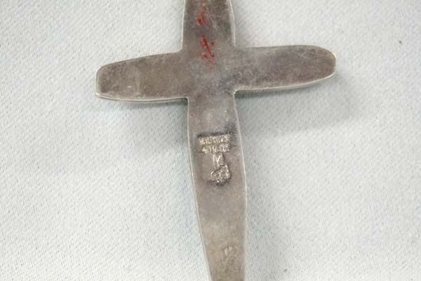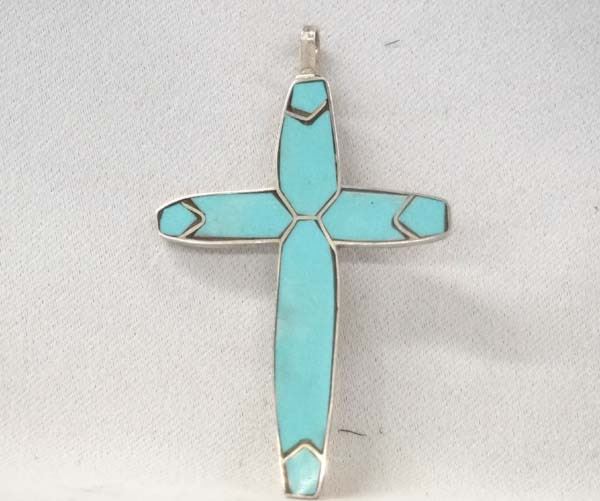 Native American Sterling Silver Turquoise Cross Pendant, hallmarked with a hummingbird, stamped handmade sterling, measures 3''L x 1.5''W