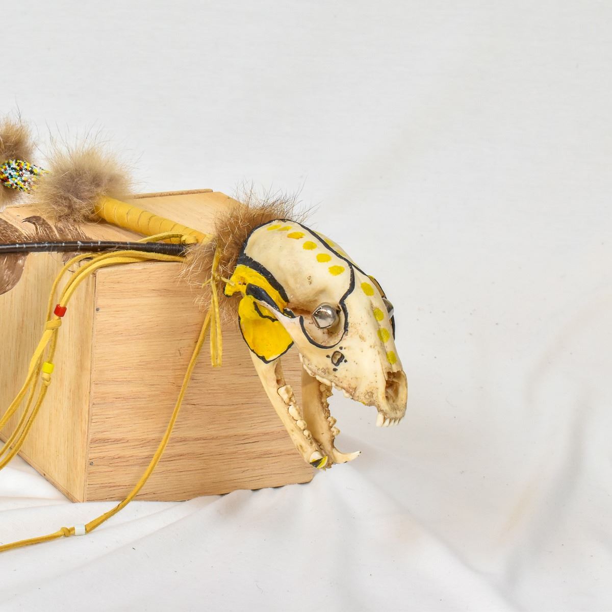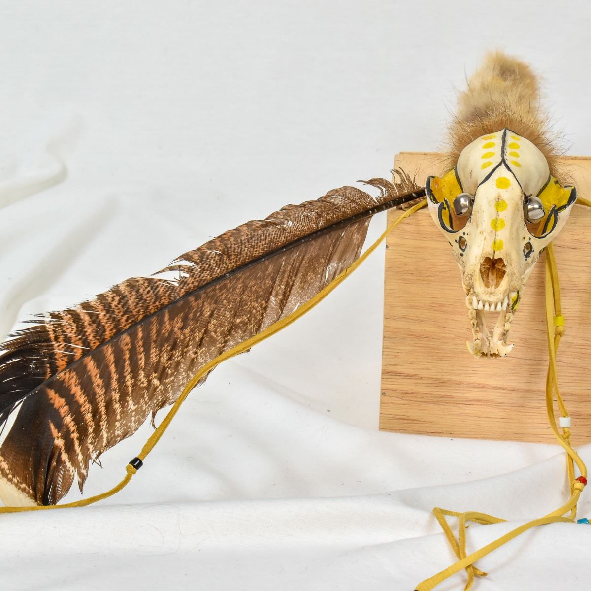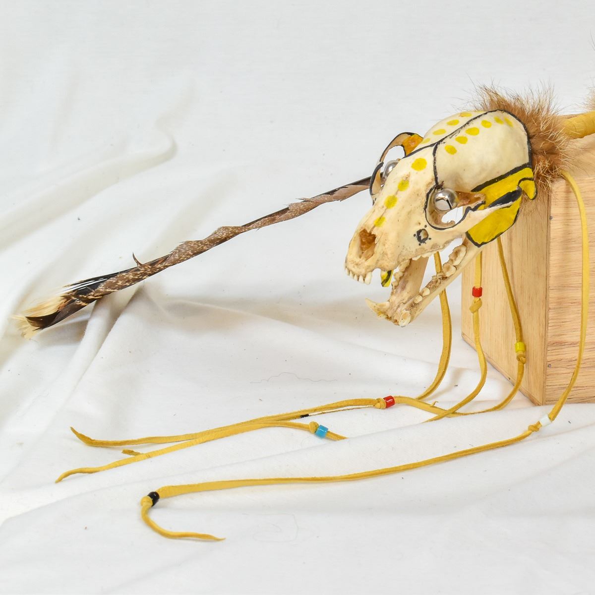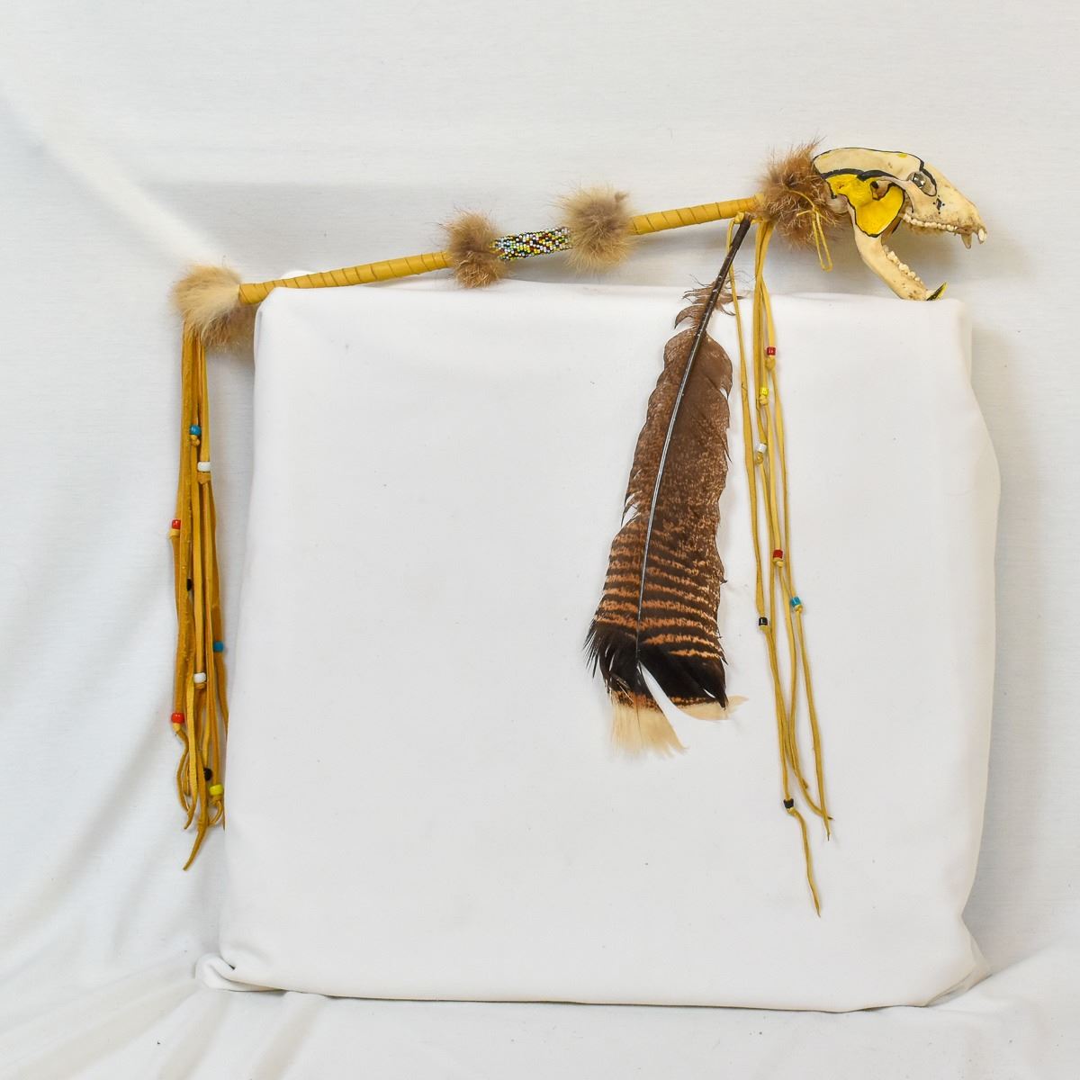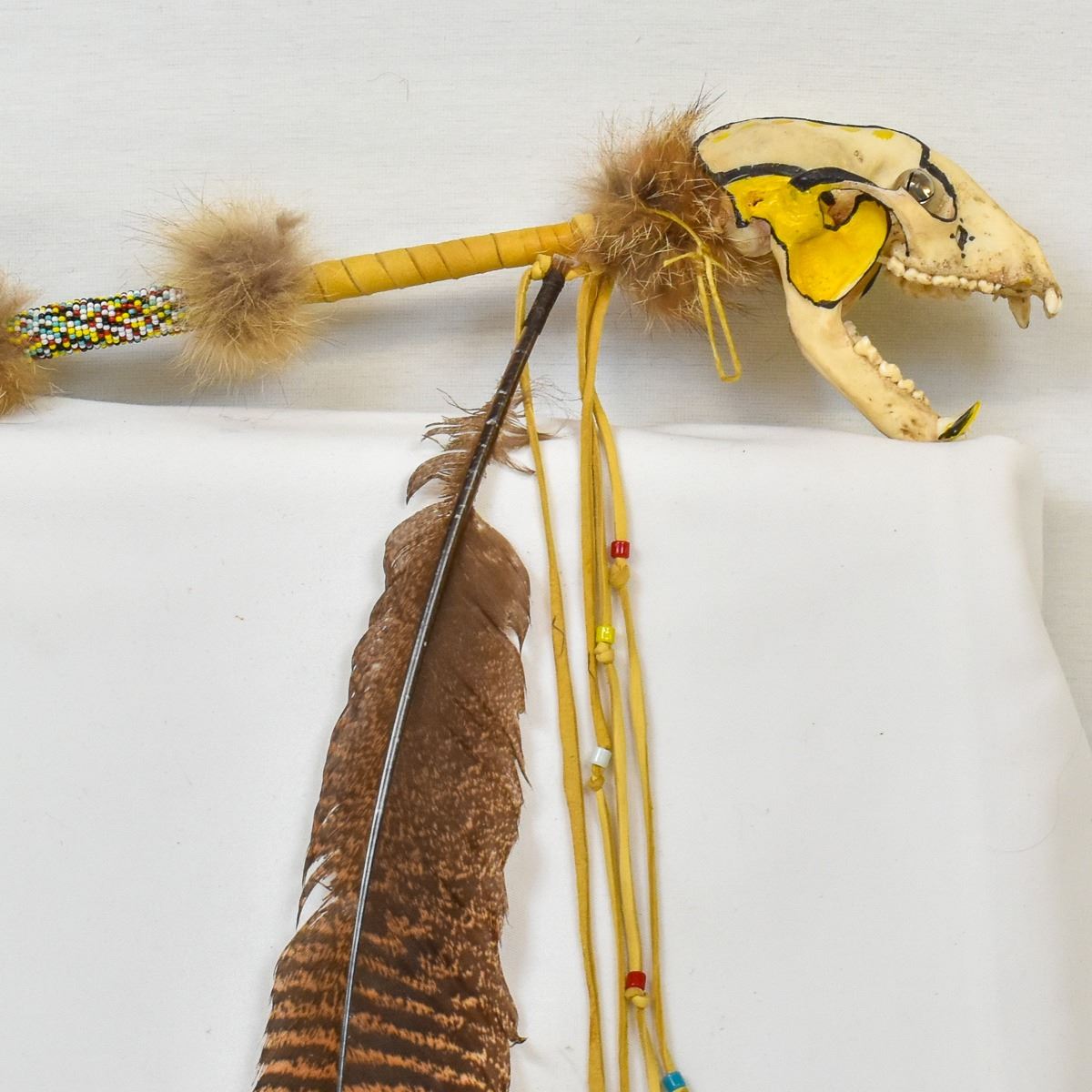 Native American Skull Dance Wand, measures 21''L x 17'' including fringe, embellished with bells, fur, feathers, leather fringe, and beads, painted skull