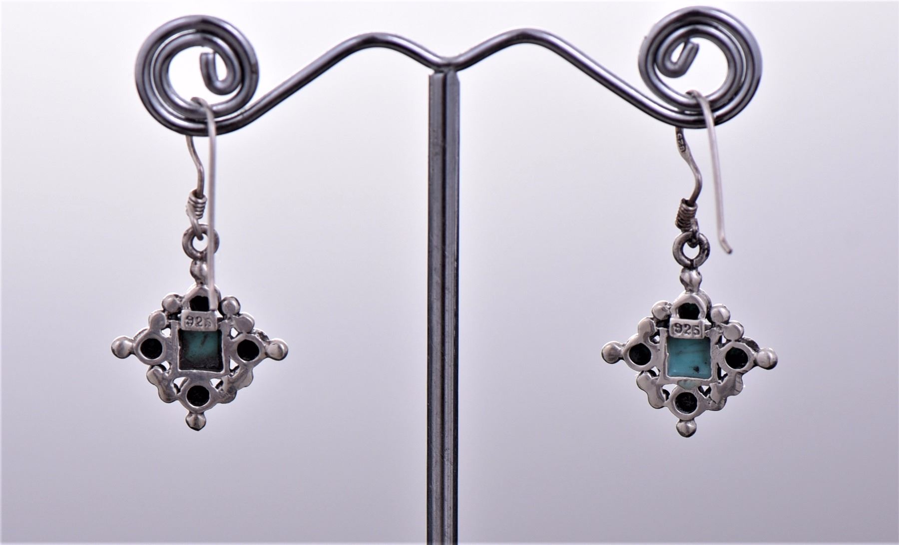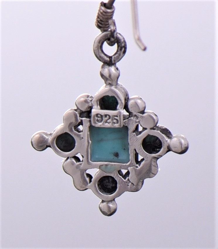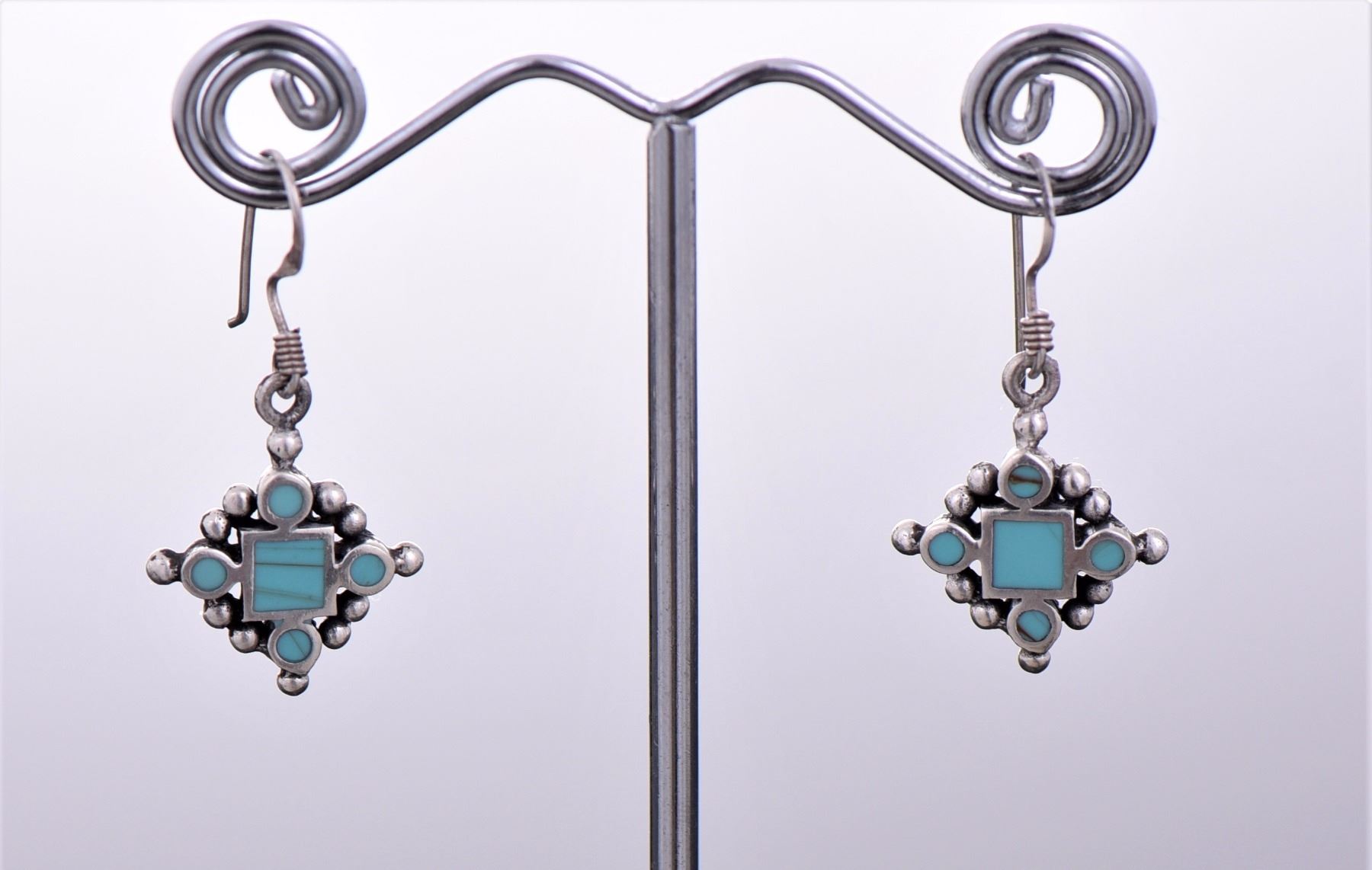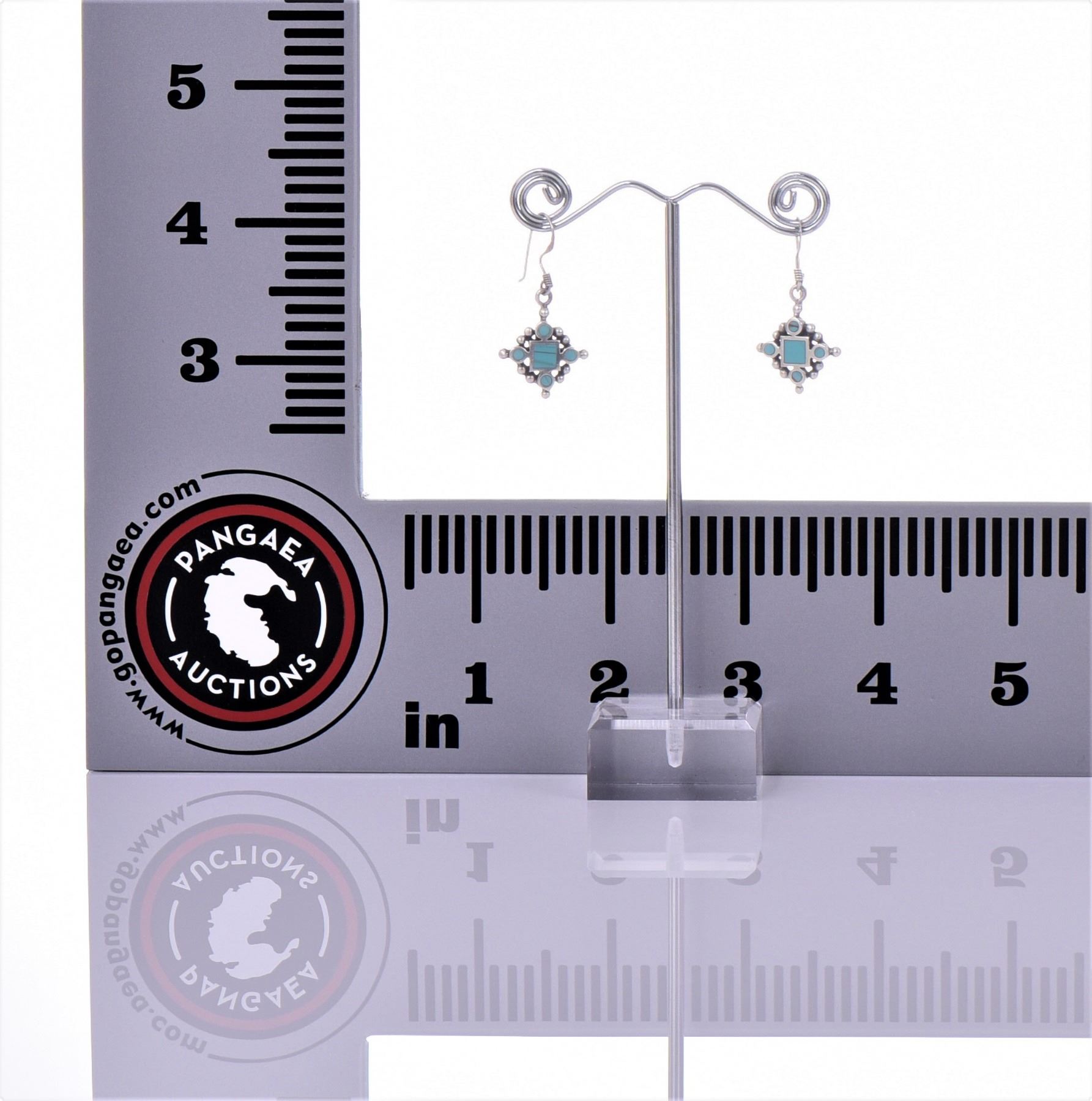 Native American Sterling Silver And Blue Turquoise Dangling Earrings. Silver Tested. Estimated less than 50 yrs. old. Native Americans also known as American Indians or just simply Indians are considered to be people whose pre-Columbian ancestors were indigenous to the lands within the nation's modern boundaries. These peoples were composed of numerous distinct tribes, bands, and ethnic groups, and many of these groups survive intact today as partially sovereign nations. The Iroquois, living around the Great Lakes and extending east and north, used strings or belts called wampum that served a dual function: the knots and beaded designs mnemonically chronicled tribal stories and legends, and further served as a medium of exchange and a unit of measure. The keepers of the articles were seen as tribal dignitaries. Pueblo peoples crafted impressive items associated with their religious ceremonies. Kachina dancers wore elaborately painted and decorated masks as they ritually impersonated various ancestral spirits. Sculpture was not highly developed, but carved stone and wood fetishes were made for religious use. Superior weaving, embroidered decorations, and rich dyes characterized the textile arts. Both turquoise and shell jewelry were created, as were high-quality pottery and formalized pictorial arts. Navajo spirituality focused on the maintenance of a harmonious relationship with the spirit world, often achieved by ceremonial acts, usually incorporating sand painting. The colors made from sand, charcoal, cornmeal, and pollen depicted specific spirits. These vivid, intricate, and colorful sand creations were erased at the end of the ceremony. (Wikipedia) Size and/or Weight: See Measurement Photo. (Photos Represent The Lot Condition, Pangaea Auctions)