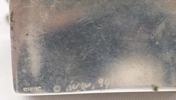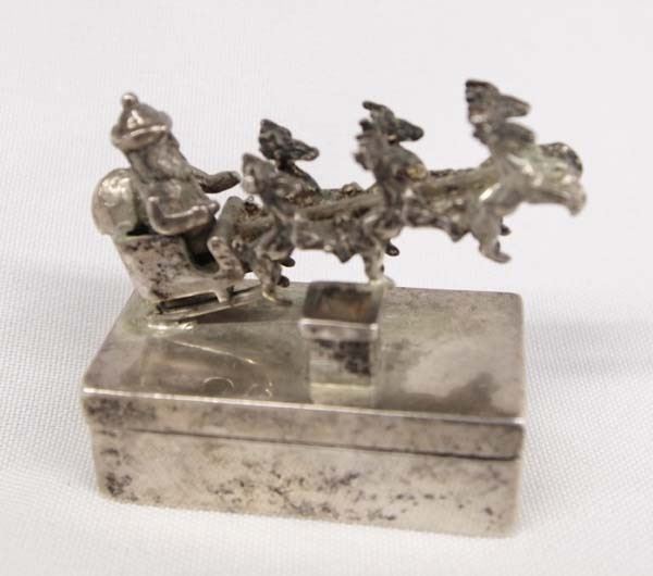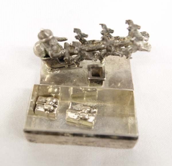 1994 Native American Sterling Silver Santa Claus ''Up on the Housetop'' Lidded Box, measures 2.5''L x 2.25''L x 1'', inside the box there are two little sterling silver presents, hallmarked and stamped sterling, 108.2g in total wt.