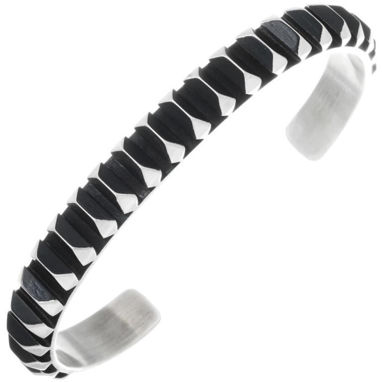 by Leander Tahe. This Native American Silver Cuff by Navajo Leander Tahe features a design that will have you doin' a double take! A simple pattern, the diamond shaped ridges are heavily oxidized to provide depth and contrast to this all Sterling bracelet that's finished with a satin buffing. A signature style for Leander, it's 3/8" wide and will best fit a 6" to 7-1/2" wrist. It's signed and stamped Sterling.