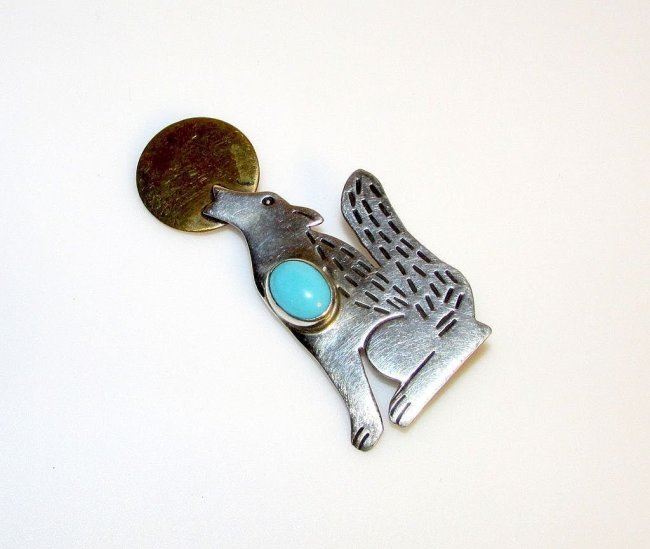 For your consideration is this fabulous vintage sterling silver Native American wolf coyote brooch in wonderful vintage condition. The brooch features a figural coyote wolf howling at the moon design in sterling silver accented with a lovely blue turquoise cabochon. Wonderful attention to detail, superb southwestern design. The brooch measures 2" long by 1" wide at the widest point. It is marked "sterling" on the back and is stamped with the artist's hallmark.