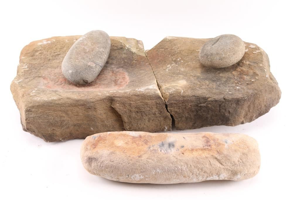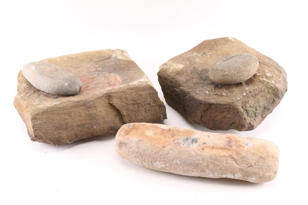 A metate with hand stone and two other stone artifacts. Metate measures 12" x 12" x 5". One other measures 13" long. BUYER MUST ARRANGE OUTSIDE SHIPPING.