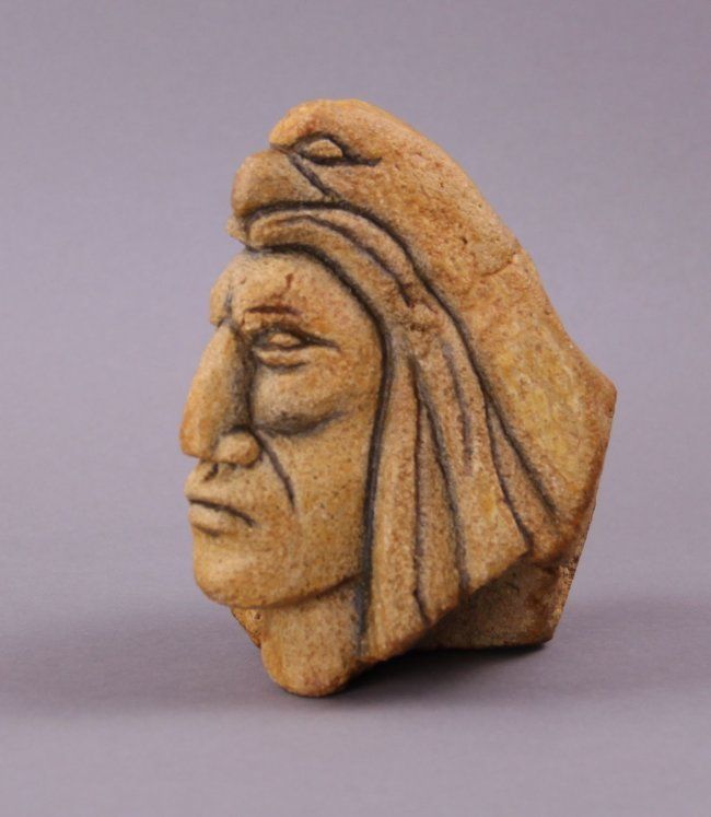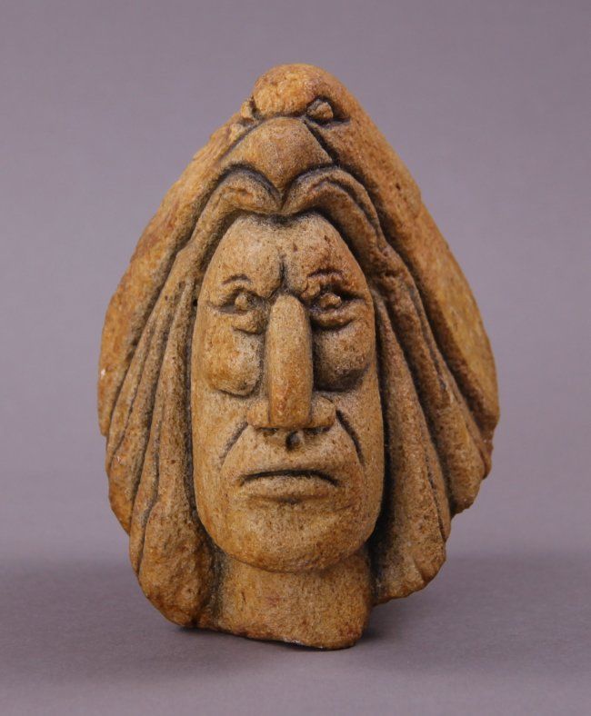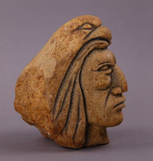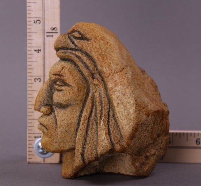 Native American Stone Sculpture of a Warrior with an Eagle headdress, signed "LHIH 8-3-89"(Size: See last photo for measurement.) Photos are part of the description representing the condition report. Pangaea Auctions urges Bidder's to view all attached photos.