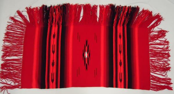 Native American Style Red Shawl. Measures approx. 56'' x 28'' without fringe. Fringe measures approx. 9 1/2''. SHI $20.