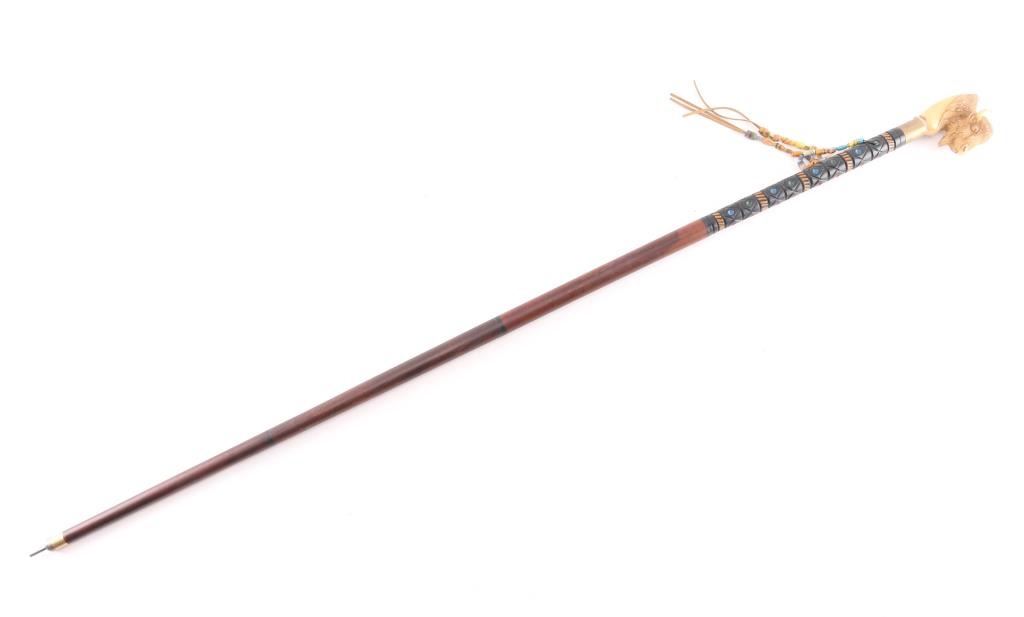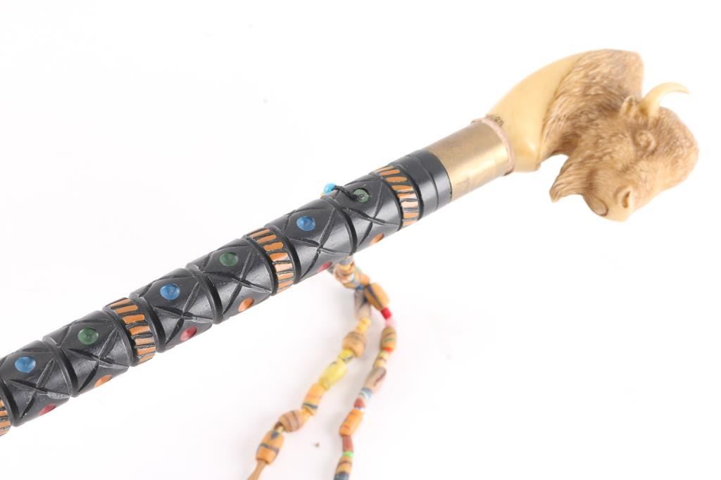 By Robson Design, with resin buffalo head handle and embellished with 2 hanging leather strands of beads. Measures 47".