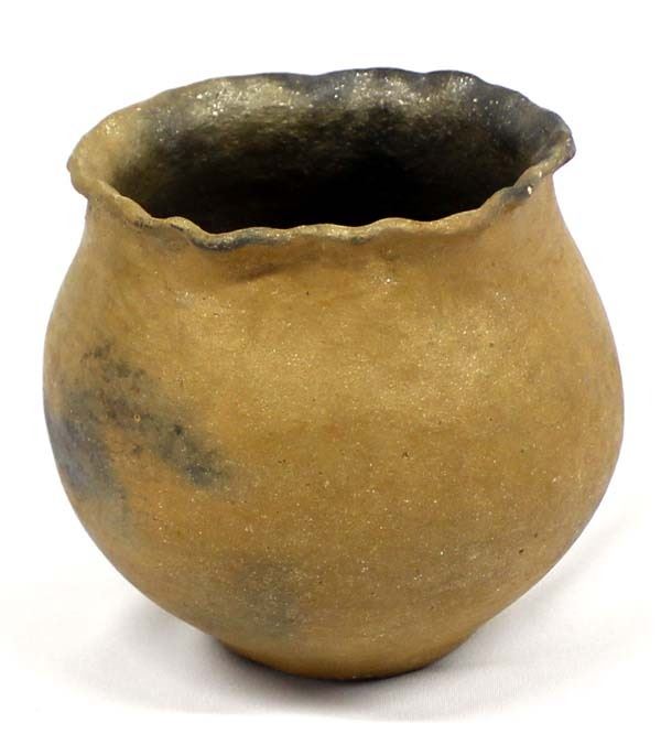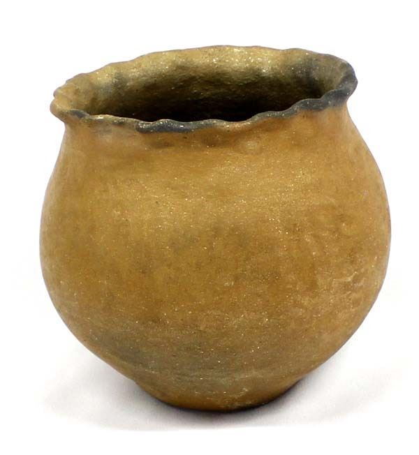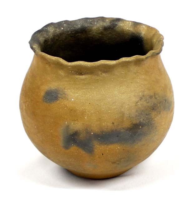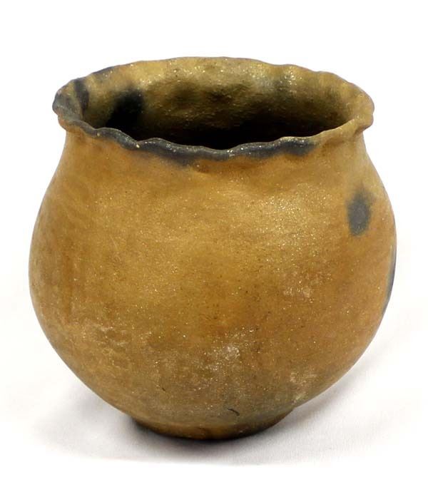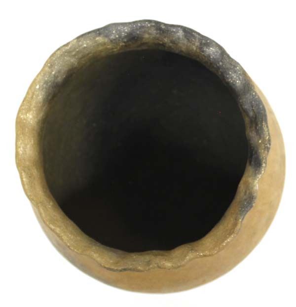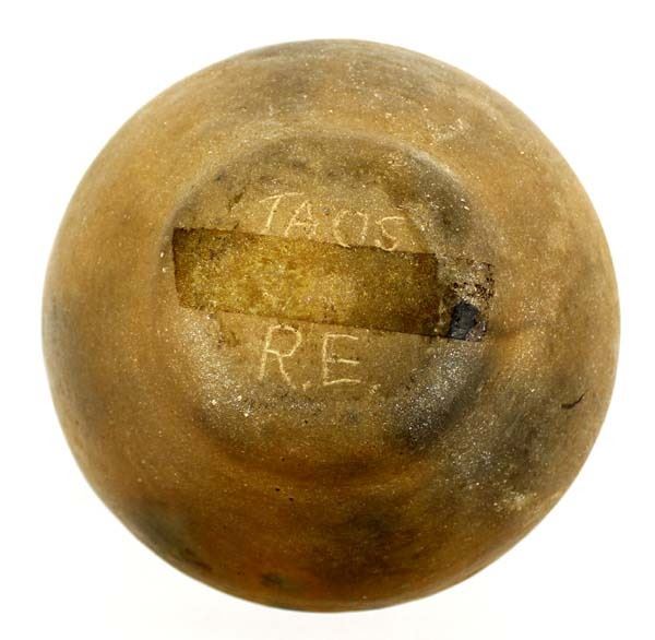 Native American Taos Micaceous Clay Pottery Bowl, fluted rim, measures 6'' x 6'', artist's initials R.E. on the bottom, fire clouds present