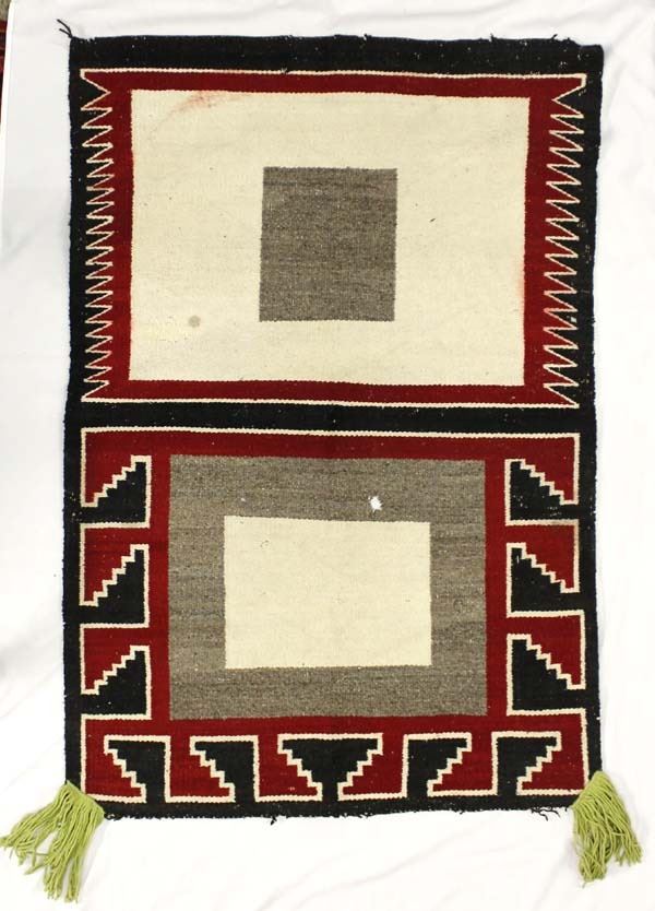 Vintage Native American Textile Parade Saddle Blanket, measures 53'' x 36'', many worn areas, long green tassels on 2 of the corners