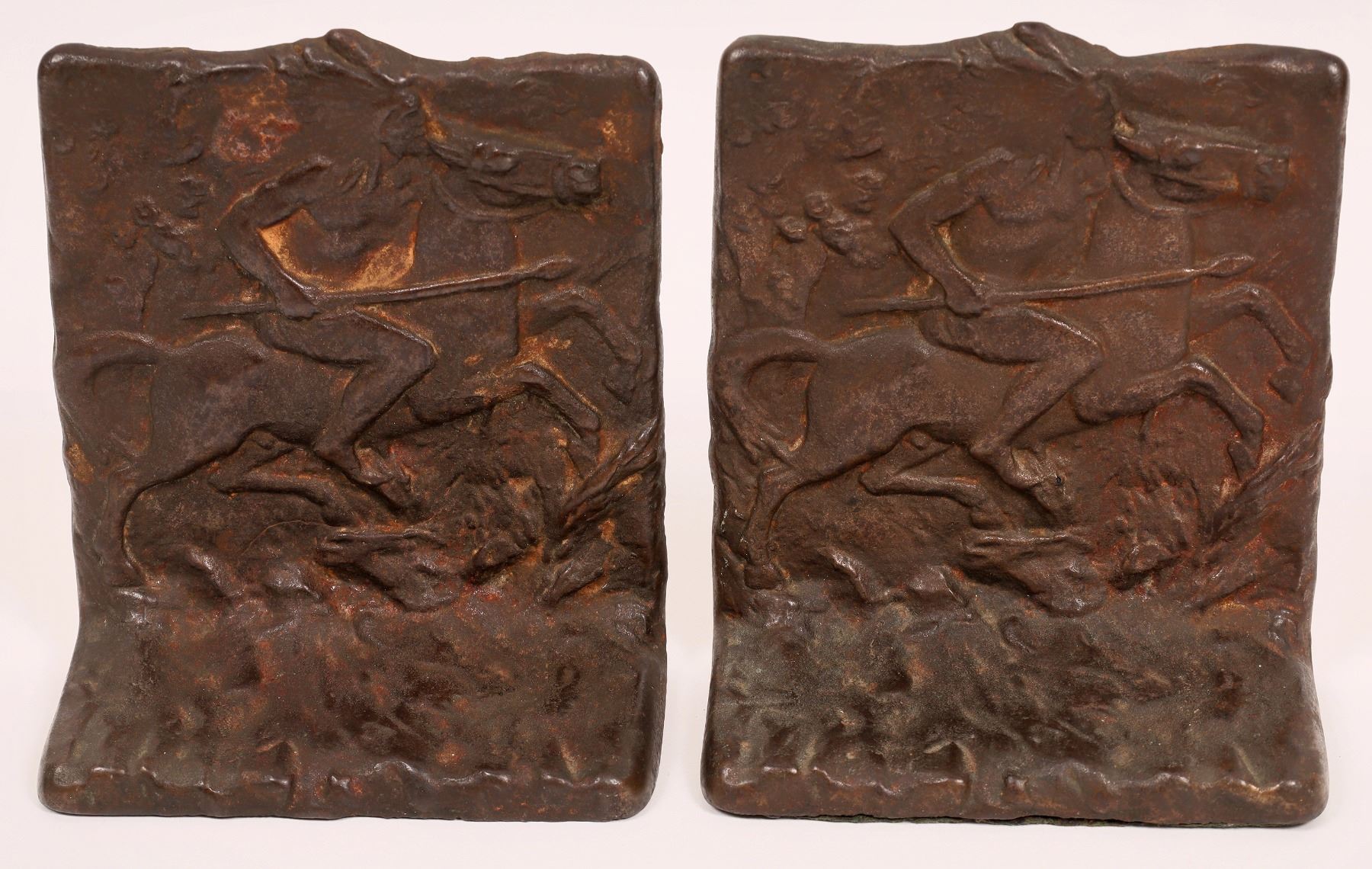 Pair of original cast iron bookends with Indian on horseback casting. No signature found will need a little oxalic acid restoration otherwise fine.