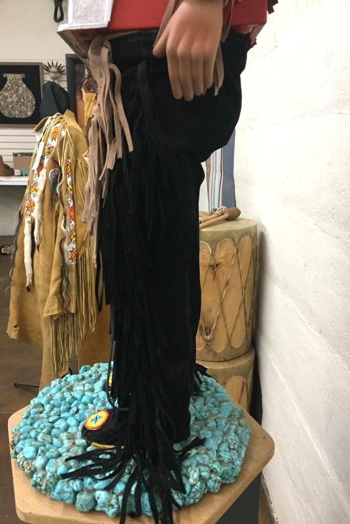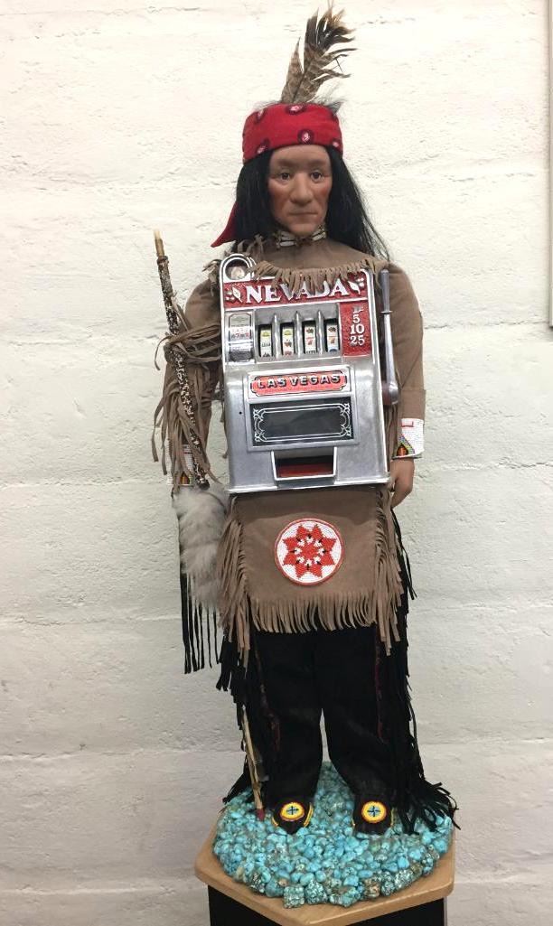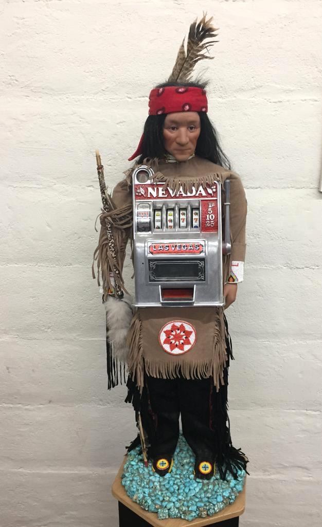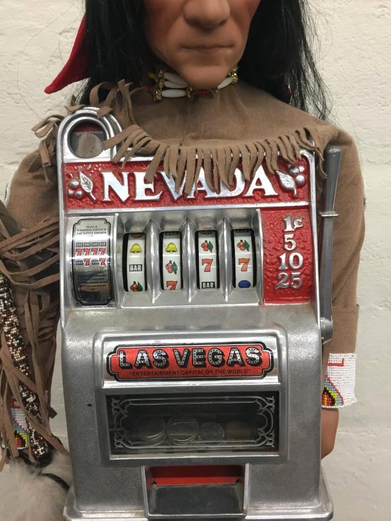 Description: For your consideration we offer this quirky Native American themed slot machine. The man is wearing traditional looking leather attire with leather fringe and beadwork. He is standing on a bed of faux turquoise nuggets. The slot machine is a novelty machine and works with or without coins. Apparently there is a little key you can insert and turn to release the coins, but we do not have it. Maker: Unknown. Approx. Age: Vintage. Size: 13 inches wide x 41 inches tall. Condition: Good for its age, normal wear expected. Please look closely at the pictures - they are an important part of our description. Shipping: There will be a $25 handling / packaging fee for shipping this lot. The actual cost of postage will be added on top of that.