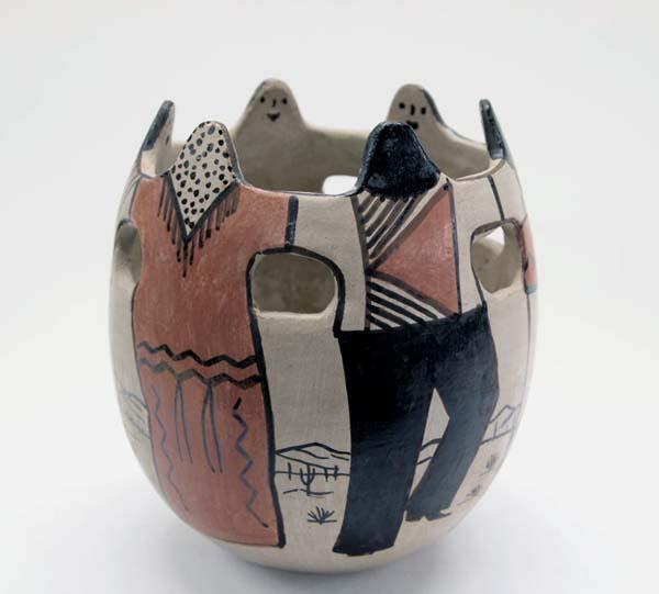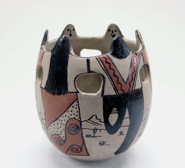 Native American Tohono O'Odham Friendship Jar by Angea, Polychrome, Depicts 6 Figures and Landscape Design. Measures approx. 6''H x 5''Diameter. Buyers Pay Actual Shipping and Handling Charges(see terms and conditions for more information).