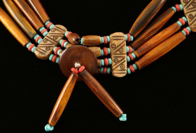 Turquoise and coral beads with etched and stained bone slabs and stained bone hairpipe tubes. About 13 1/2" long by Navajo Sharon Joe.