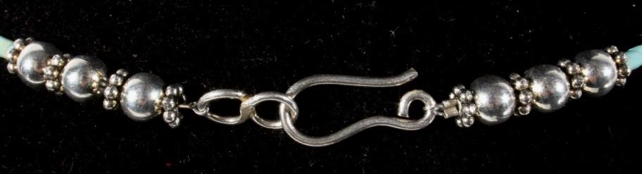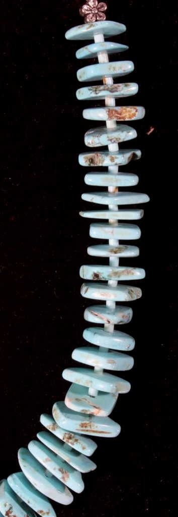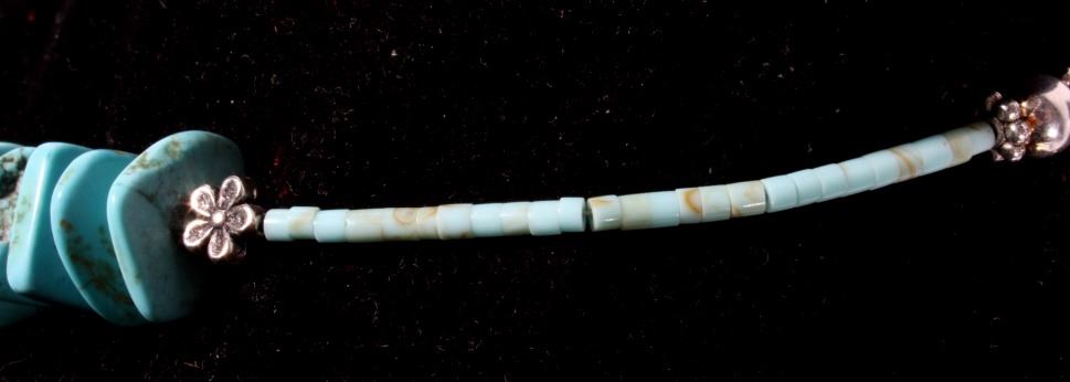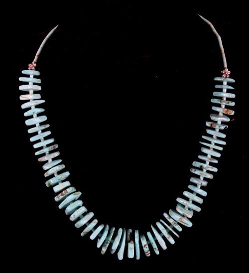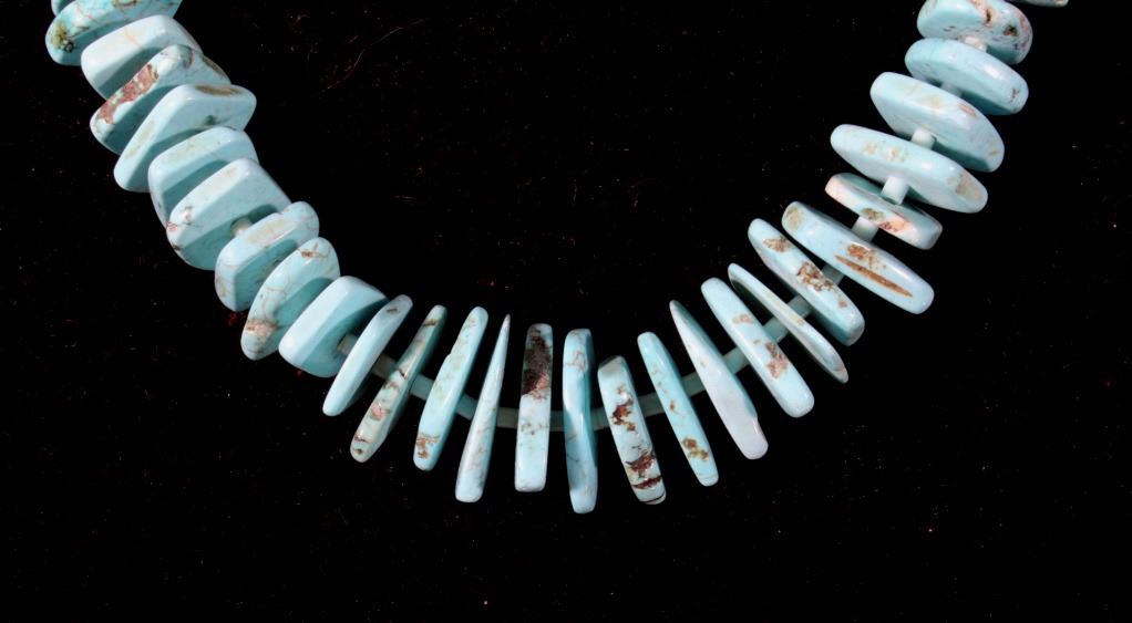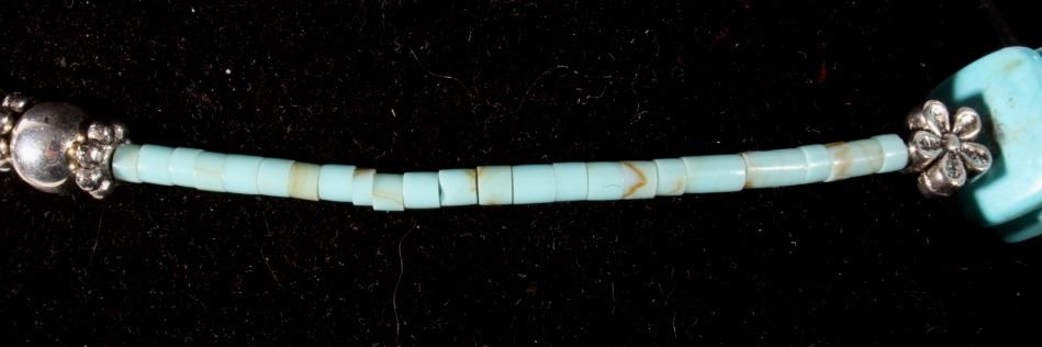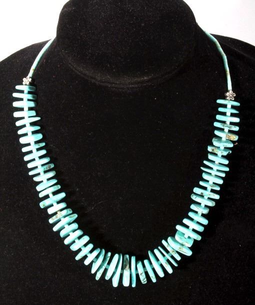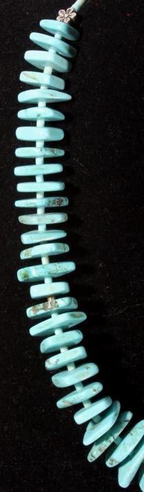 For your consideration in this lot we have a Native American turquoise discoidal necklace. The necklace is made of 55 blue gem turquoise beads. Each large piece of turquoise is separated by a smaller piece of cylindrical turquoise. The piece is in good condition. The necklace measures 21" long unclasped and 10" long clasped.