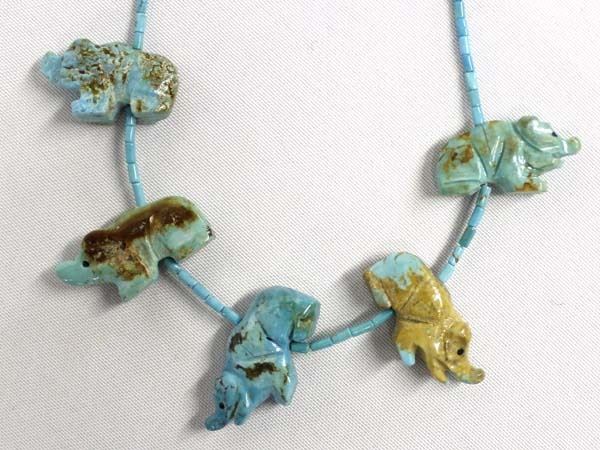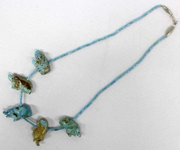 Vintage Native American Navajo Carved Turquoise Elephant Fetish Necklace, measures 20''L end to end, largest elephant measures 1.5''L, embellished with sterling beads and turquoise heishi, sterling clasp
