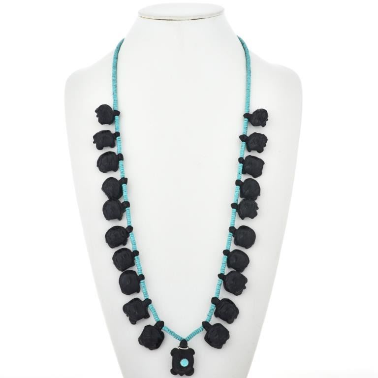 This displays 21 hand carved, Onyx turtles strung in traditional pueblo style with genuine Turquoise wheel beads (4mm wide). The 1-1/4" x 1" center is wire wrapped and Turquoise accented. It's 32" long including the Sterling lobster claw clasp.