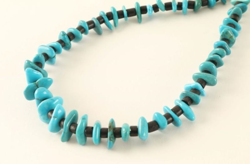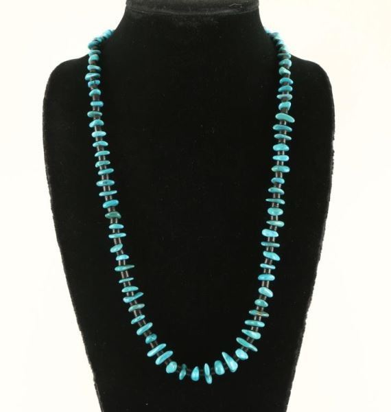Turquoise chips with black heishi and sterling clasp. About 26 3/4" long by Navajo Berlinda Begay.