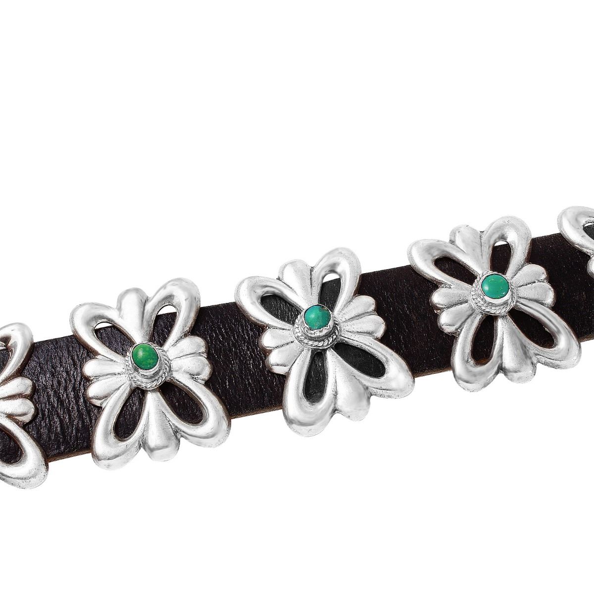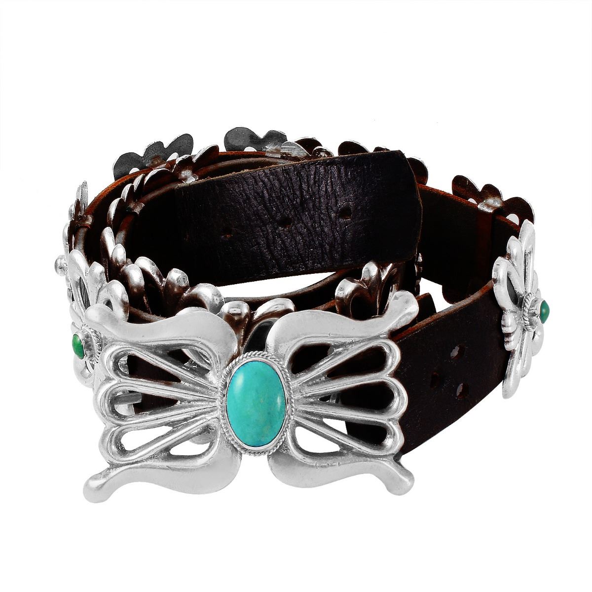 Beautiful, hand made genuine leather Native American Concho belt created with multi brightly polished silver turquoise nugget detailing, bezel set and framed with beaded detailing, showing the craftsmanship. Turquoise has been carefully matched by hue (greenish blue). Belt measures 35 " in length. Buckle is hinged in the front.SpecificationsJewelry InformationCategory: Handbags, Leather Goods, ShoesCategory Style: SterlingNew/Used: Pre-OwnedGender: UnisexLength (inches): 35"Metal: Sterling SilverTotal Weight: 415 GramsInternal ID:1569DisclaimersThe descriptions listed should not be construed as an appraisal. The detail is provided as a guideline for color, clarity, weights and measurements to the best of our ability. We welcome inspections. WE SHIP WORLDWIDE!This item has a Reserve established by our consigner.