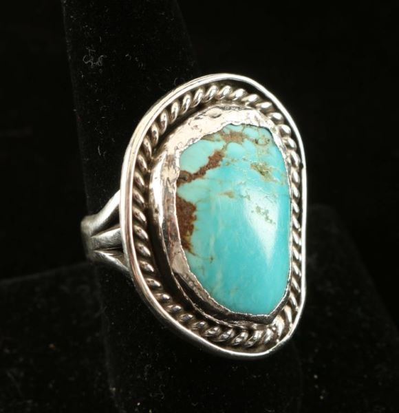 Large 1" turquoise cab surrounded with a rope design set in sterling silver. Size 9 1/4.