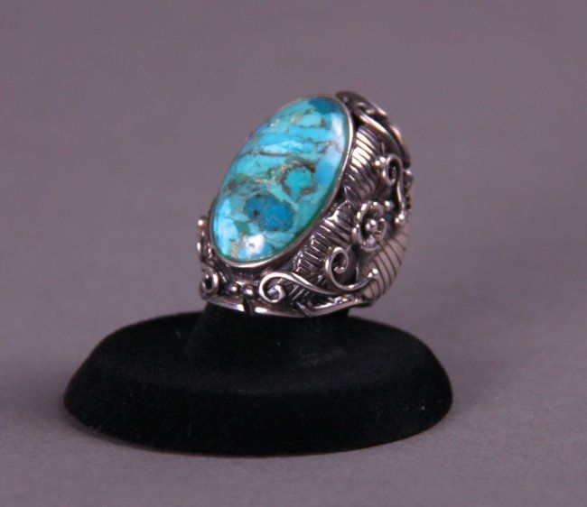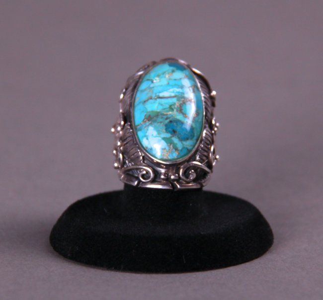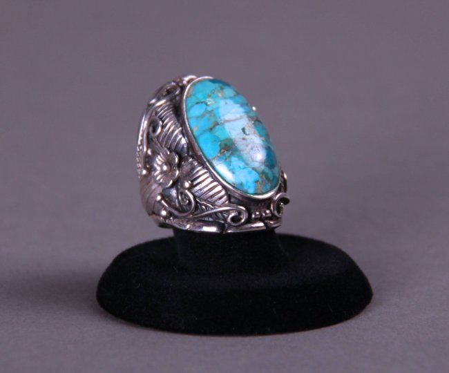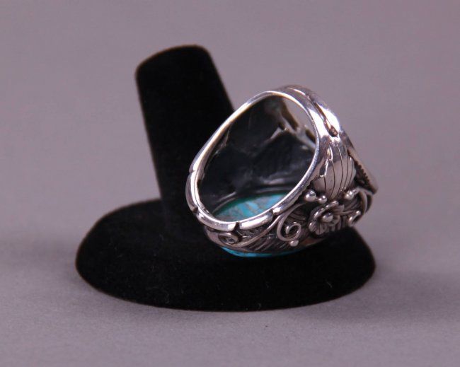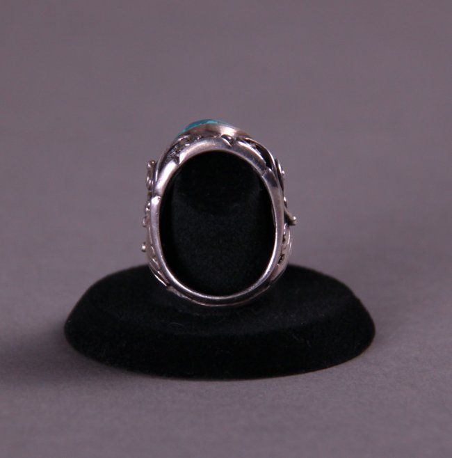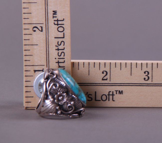 Native American Turquoise and Sterling Silver Ring with floral design and drip work. Stamped 925.(Size: See last photo for measurement.) Photos are part of the description representing the condition report. Pangaea Auctions urges Bidder's to view all attached photos.