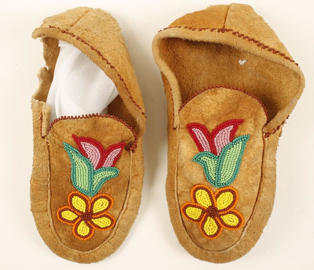 One moccasin is damaged, probably chewed by a pet at some time, the other is undamaged.