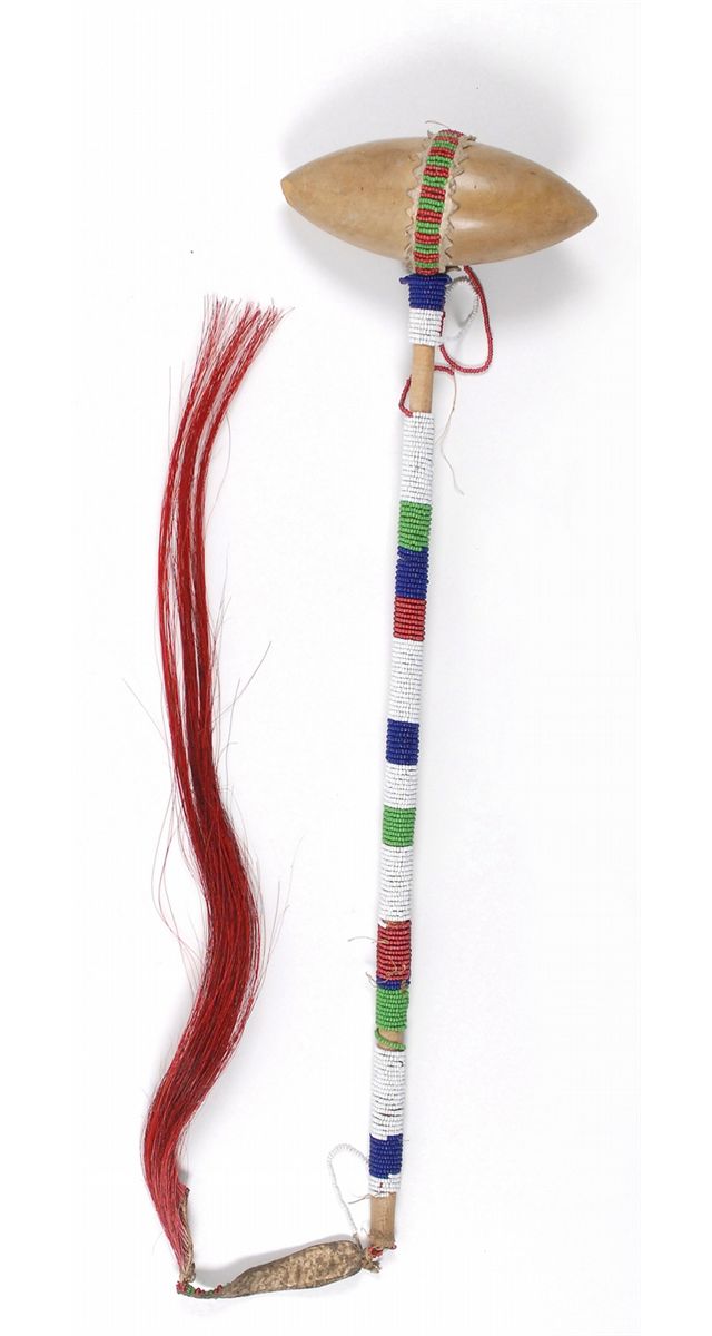 Sioux Indian stone head war club, comprised of a 16.5? long handle wrapped in tiny red, blue, green, and white beads, attached to a oval-shaped stone with pointed ends, measuring approximately 5.25 x 2, the center of which is wrapped in a strip of bead-decorated animal hide. A long plume of red-dyed horse hair is also suspended from the bottom of the handle by a beaded section of hide. In fine condition, with a few loose strands of beads and a chip to one point of the stone. Dated post-1900 (likely circa 1930s), this style of club was generally made by the tribes to sell; a more attractive version of those used in their daily lives, both as weapons and to break open buffalo bones to obtain the marrow inside.