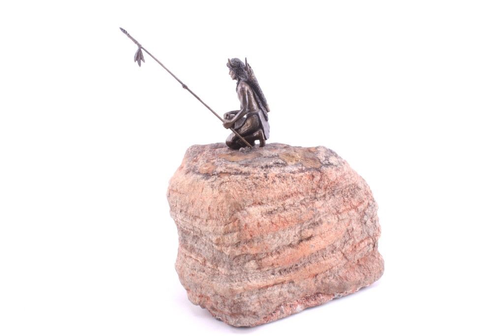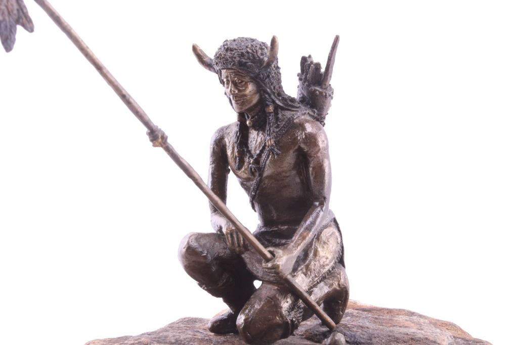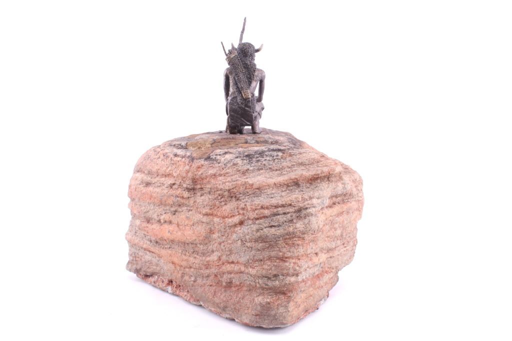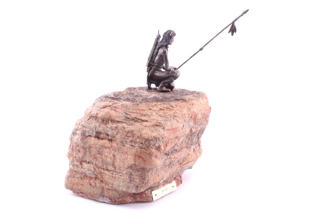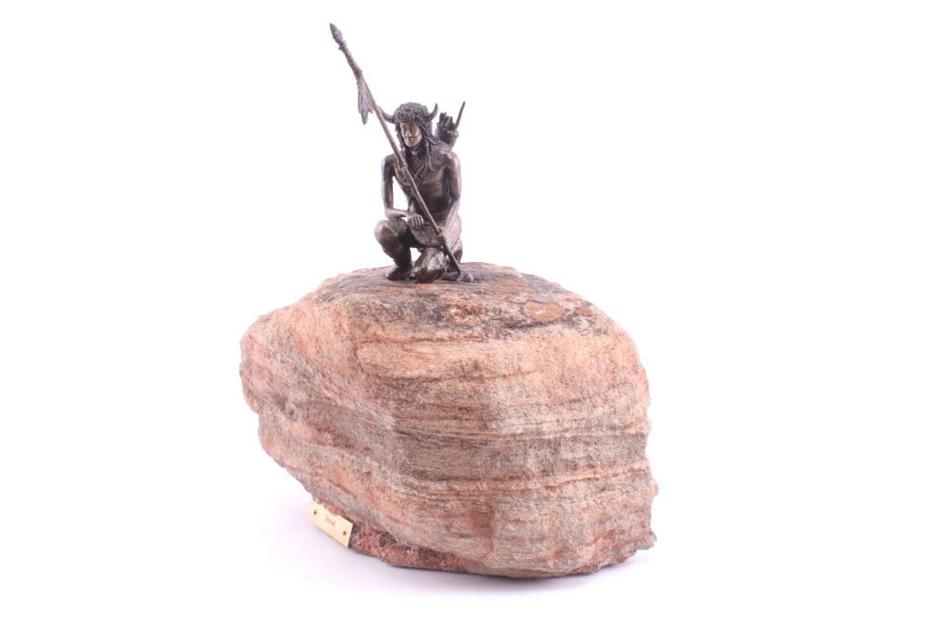 Offered in this lot is a bronze and stone piece of a Native American warrior titled "Sentinel". The bronze shows a Native American warrior kneeling and holding a spear. The warrior is approximately 4" X 2" X 2" and the spear is 7" long. The Warrior is wearing a loincloth, a necklace, a bow and arrow quiver on his back and a Buffalo headdress. His war lance has three feathers and an arrowhead tip. This small bronze is mounted to a 9" X 6" X 8" piece of red, grey and black granite. This setting gives a reference to the image of a Warrior watching from the top of a rim rock, acting as a "Sentinel" for his people.