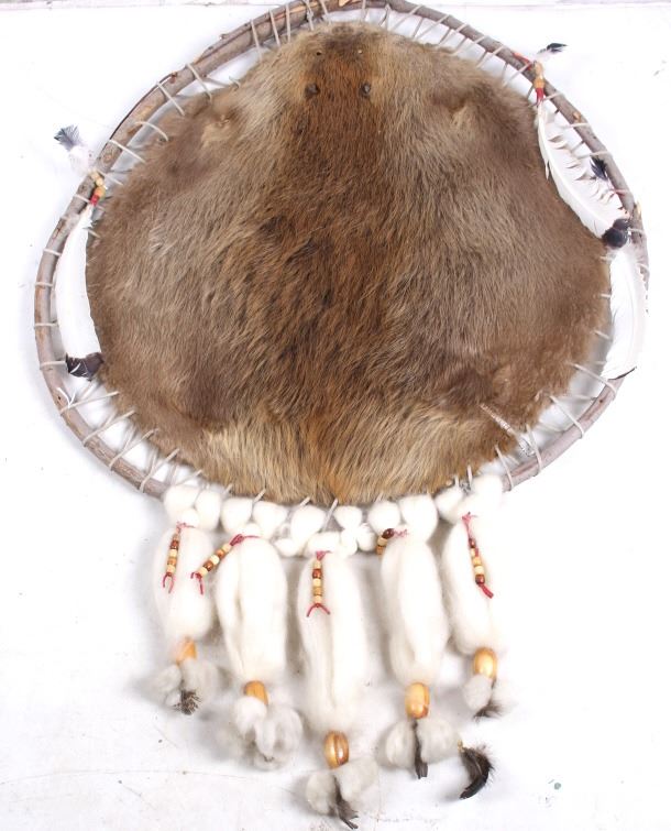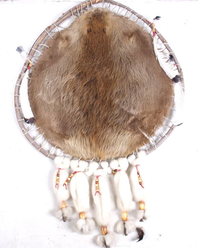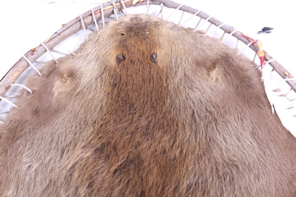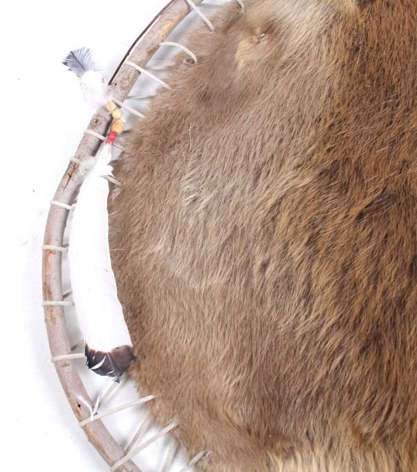 This lot features a Native American willow hope stretch beaver hide. The hide is still inside the willow hope with beaded feathers and wool designed around it. The beaver was taken in Montana and still has its original metal tag. The hide is in stunning condition. The piece is in good condition for its age. Measures: 36" Diameter