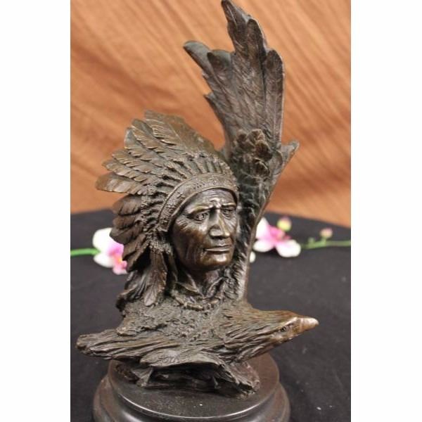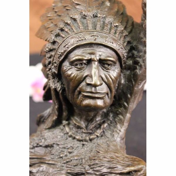 The Native American shaman, or medicine man, stands looking at something lost in the faraway horizon, bracing his head against an eagle that soars with open wings. The eagle is a sacred messenger, carrying our prayers on its wings to the creator, and returning with gifts and visions for the people. eagle feathers assist shamans in connecting with the spirit for healing. They are deemed the most sacred healing tools, a symbol of power, healing and wisdom. The bronze sculpture was molded using the ancient method of lost-wax casting and finished with brown patina tarnish. The sculpture is mounted upon a black variegated marble base. Bronze dimensions with marble base: Height 13 X width 6 inches. Weight: 12 lbs.