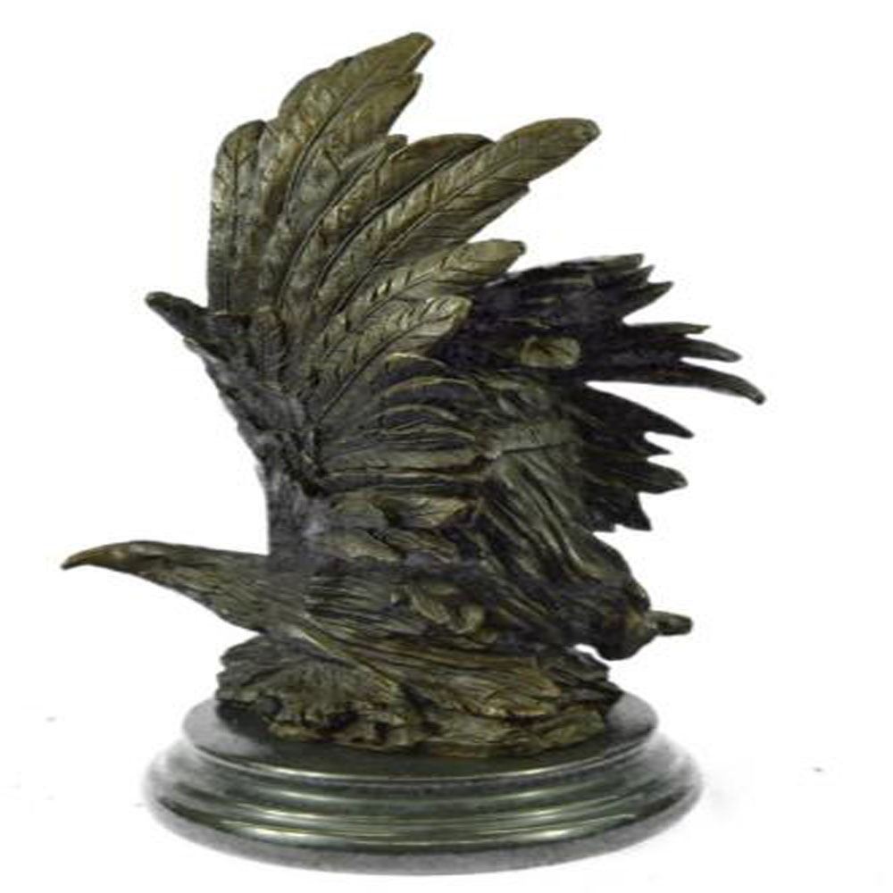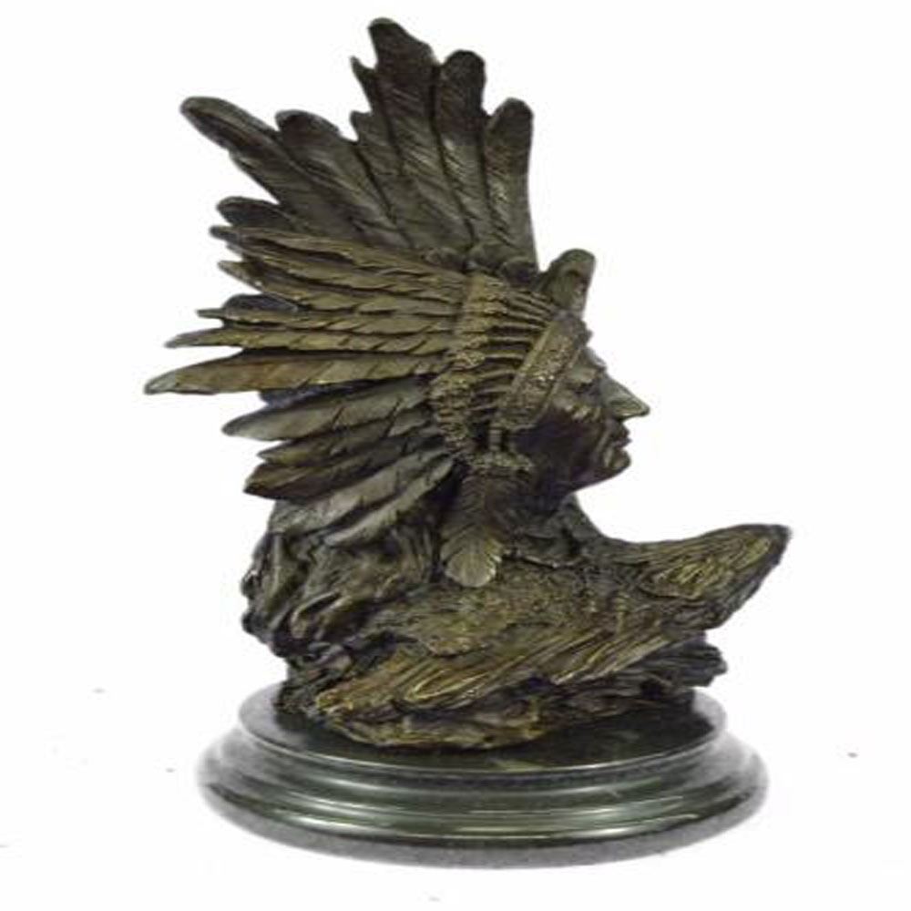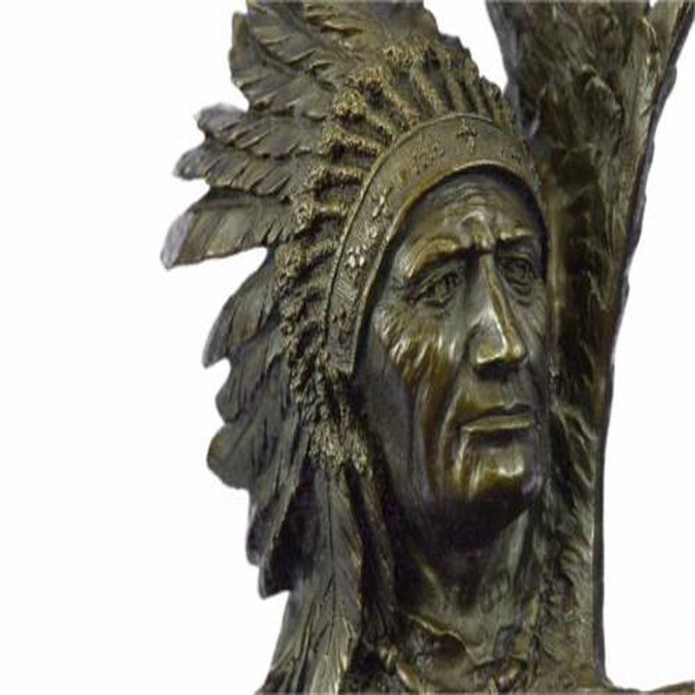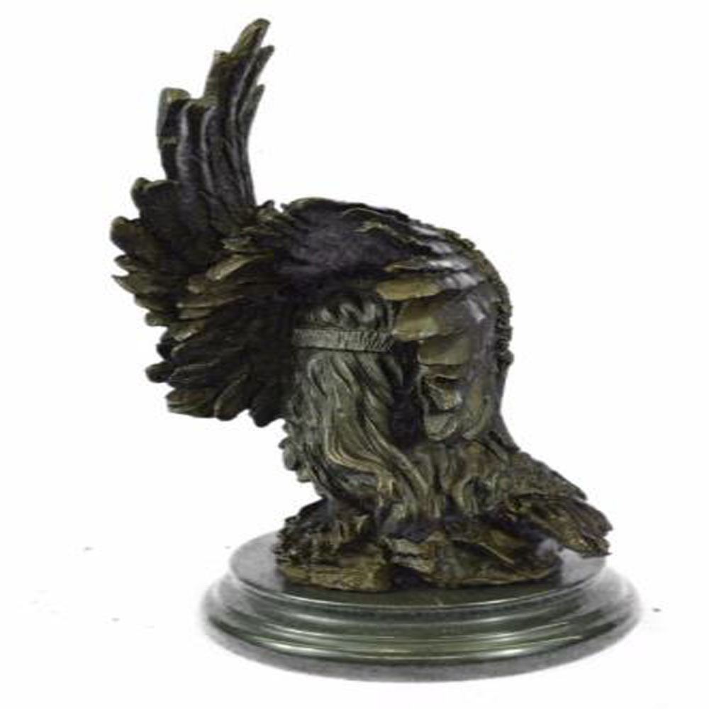 The Native American shaman, or medicine man, stands to look at something lost in the faraway horizon, bracing his head against an eagle that soars with open wings. The eagle is a sacred messenger. Eagle feathers assist shamans in connecting with the Spirit for healing. They are deemed the most sacred healing tools, a symbol of power, healing, and wisdom. The bronze sculpture was molded using the ancient method of lost wax casting and finished with a brown patina tarnish and is mounted upon a marble base. Dimensions: Height 13 X Width 6 inches. Weight: 12 LBS.