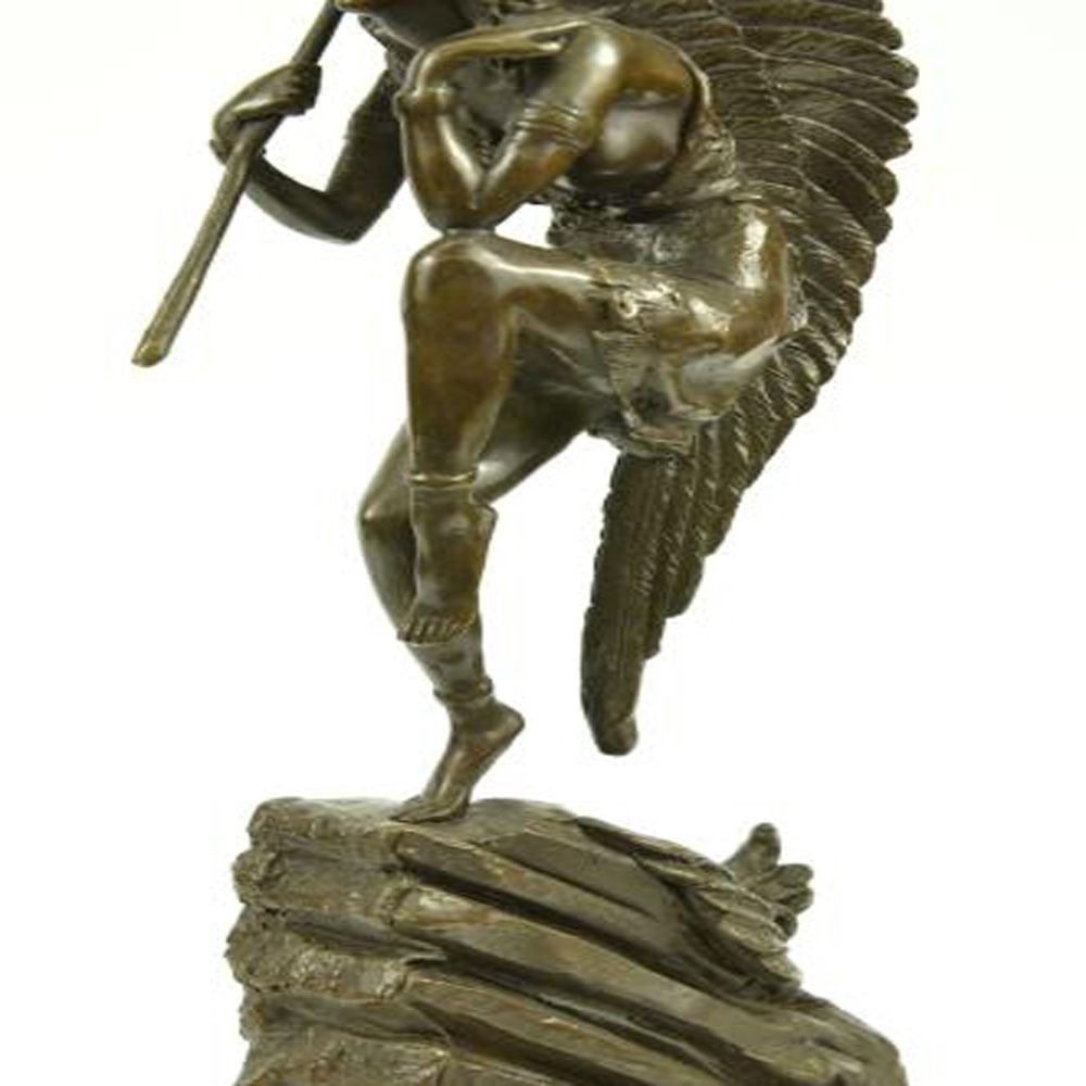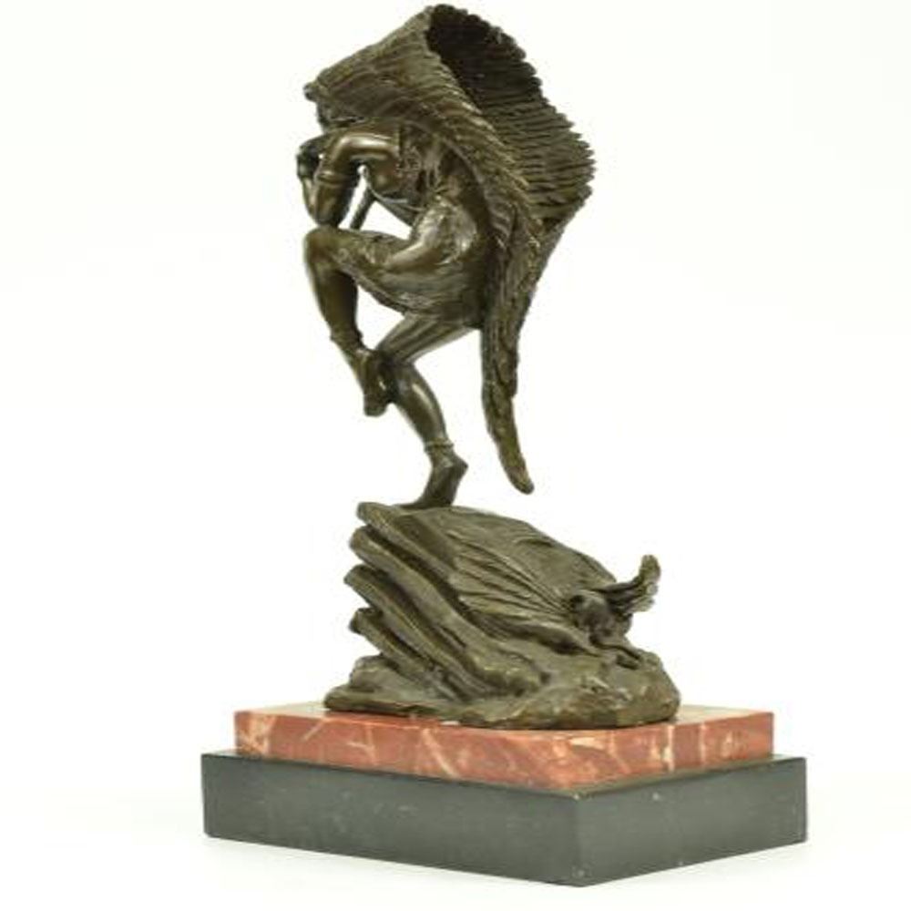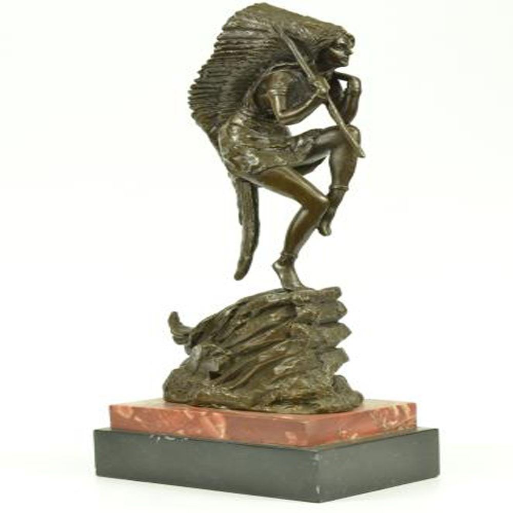 This beautiful Native American Woman that will leave you breathless. She stands on a rock on a foot, balancing herself as she dances to the tribe music. Her left leg is lifted up and so is both of her hand while she holds a wooden stick on her right hand. She is passionate about her beliefs and dances proudly with her beautiful flock of feathers custom made hat. This brown patina sculpture was cast using the Lost Wax Method and is mounted on a marble base. Bronze Dimensions with Marble Base: Height 16 X Width 6 Inches. Weight: 12 LBS.