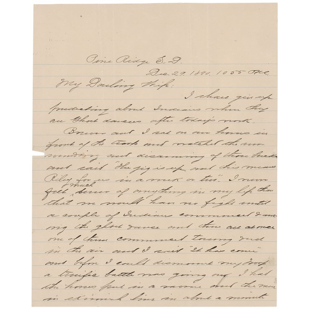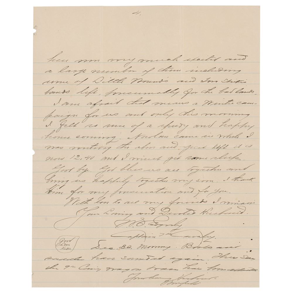 ALS signed “W. S. Edgerly, Captain 7th Cavalry,” four pages on three sheets, 8 x 10, December 29, 1890. Letter home to his wife, written in the immediate aftermath of the Wounded Knee Massacre, in which he participated. On December 29, 1890, the 7th U.S. Cavalry Regiment attempted to disarm Lakota Indians near Wounded Knee Creek on the Lakota Pine Ridge Indian Reservation in South Dakota. The tense situation soon erupted into violence that left 250-300 Lakota men, women, and children dead and 25 cavalrymen dead. In the days that followed, another 7 of the 51 wounded Lakota died, as did 6 of the 39 wounded troopers. It was the largest domestic massacre in United States history.