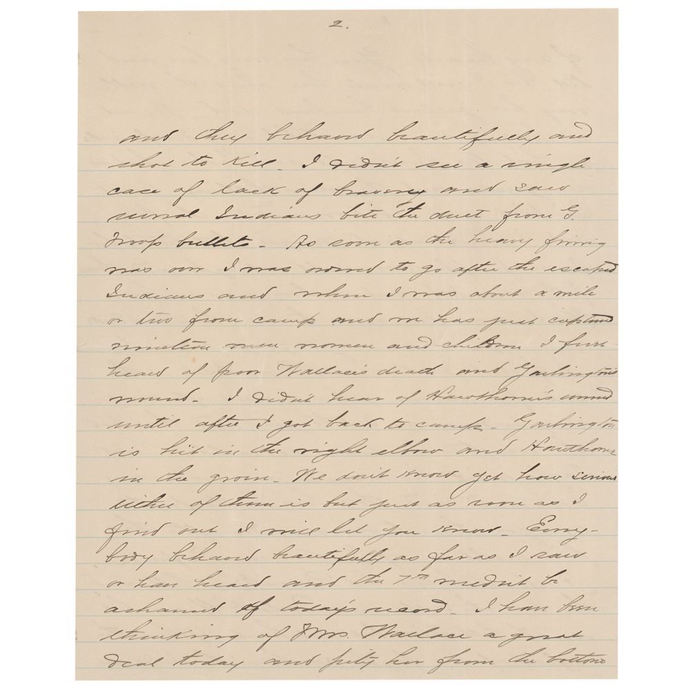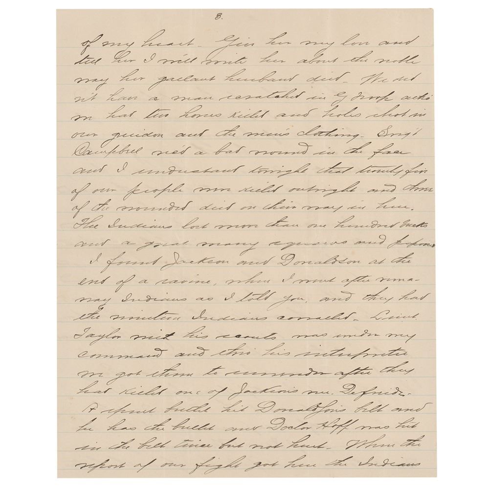 Everybody behaved beautifully as far as I saw or have heard and the 7th needn’t be ashamed of today’s record. I have been thinking of Mrs. Wallace a great deal today and pity her from the bottom of my heart. Give her my love and tell her I will write her about the noble way her gallant husband died. We didn’t have a man scratched in G Troop altho’ we had two horses killed and holes shot in our guidon and the men’s clothing. Serg’t Campbell rec’d a bad wound in the face and I understand tonight that twenty five of our people were killed outright and three of the wounded died on their way in here. The Indians lost more than one hundred bucks and a great many squaws and papooses.