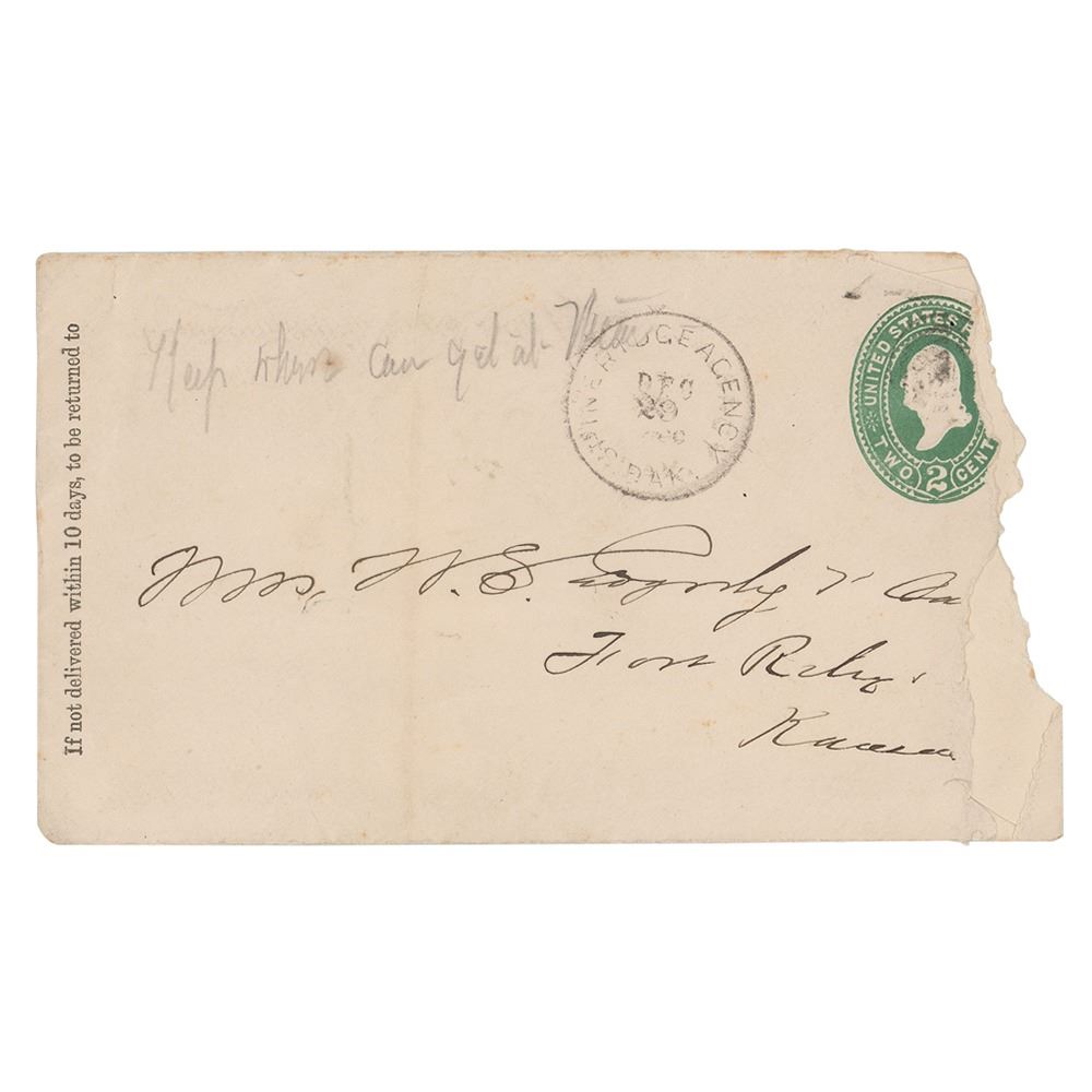 He adds a postscript: "Good Love Kiss. Dec. 30. Morning. Boots and saddles have sounded again. They say the 9th Cav’y wagon train has been attacked. Your Loving Husband, Winfield." Accompanied by the original mailing envelope, postmarked at “Pine Ridge Agency, Dak.,” and addressed in Edgerley's hand to "Mrs. W. S. Edgerly, 7th Cav., Fort Riley, Kansas." In fine condition, with splitting to the intersecting folds.