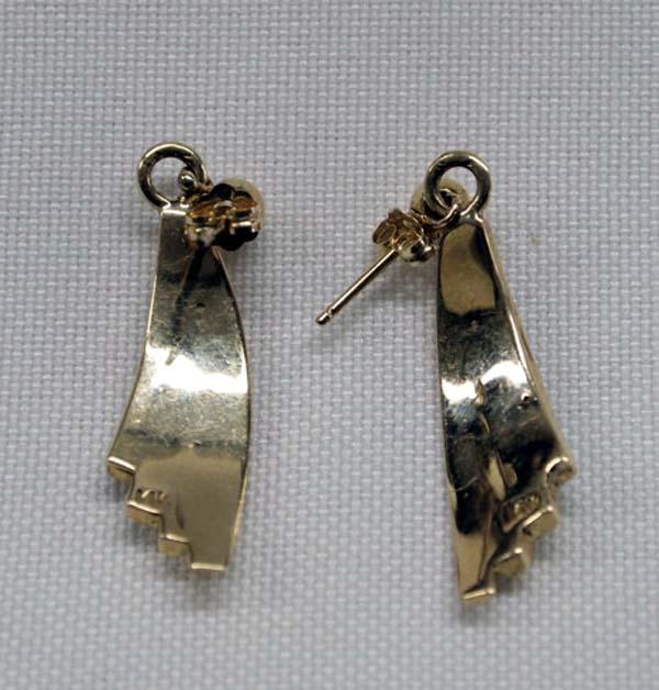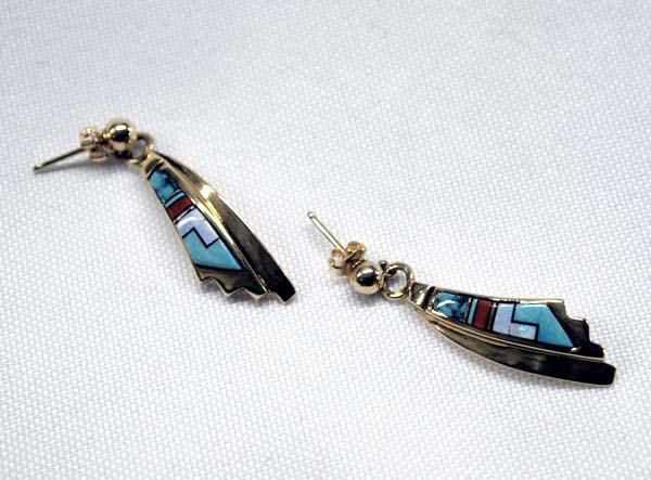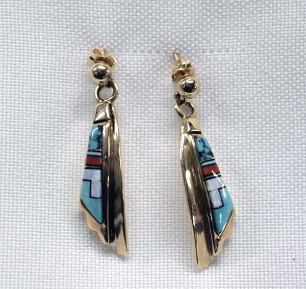 Native American Zuni 14Kt Gold pierced earrings with channel inlay. Turquoise, coral, and opal. 1.25'' x 3/8''. Buyers Pay Actual Shipping and Handling Charges(see terms and conditions for more information)