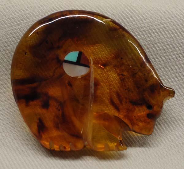Native American Zuni Amber Bear Fetish. Fetish has inlay of Turquoise, Quandelace and Coral. Measures approx. 1''H x 1 1/3''W. Buyers Pay Actual Shipping and Handling Charges(see terms and conditions for more information).