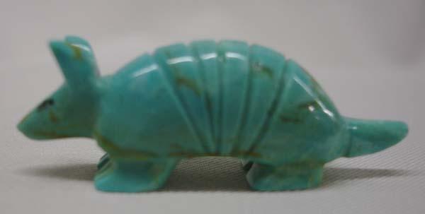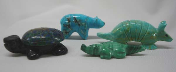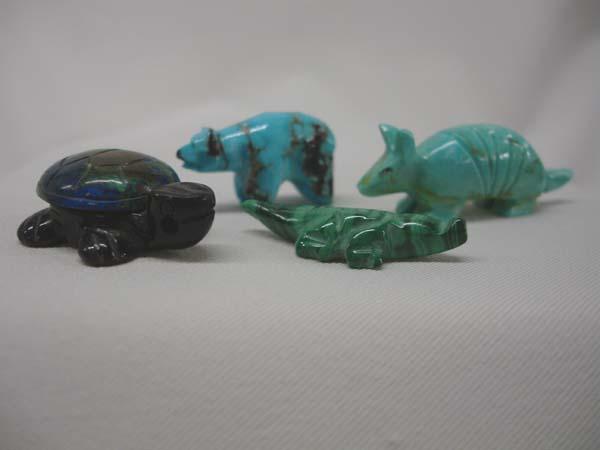 Four Native American Zuni Animal Fetishes. The turquoise armadillo is largest at 1.75'' L. One is a turquoise bear. There is a jet and lapis turtle and a malachite alligator. Buyers Pay Actual Shipping and Handling Charges(see terms and conditions for more information).