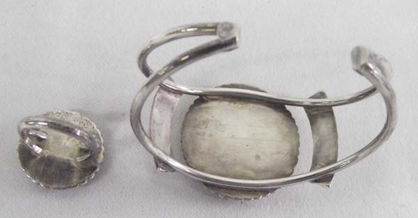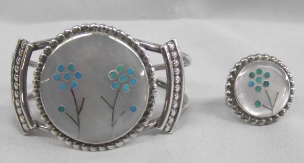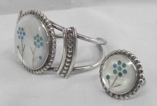 Native American Zuni Bracelet & Ring. Sterling Silver set with Mother of Pearl and Turquoise in a flower design. Measurement in Inches - Inside Length(Including Opening) 6 1/2'' x 1 3/8'' Width, ring size 7. Buyers Pay Actual Shipping and Handling Charges(see terms and conditions for more information).