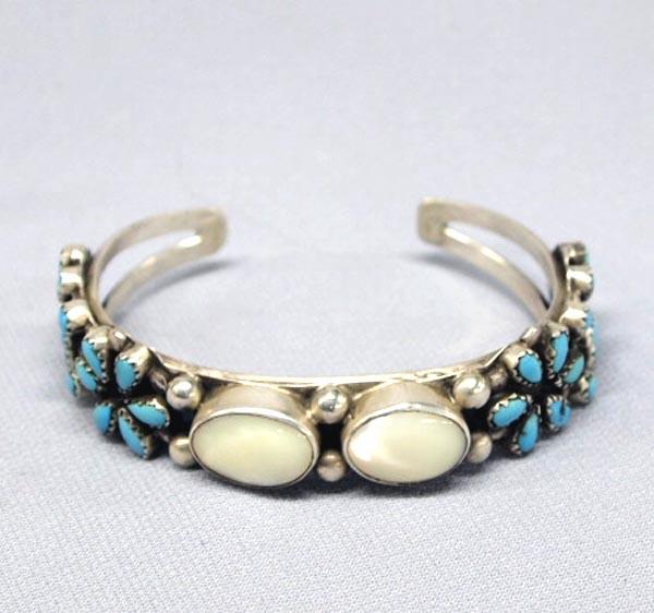 Native American Zuni Bracelet Turquoise & Shell. Large white shell stones in center measure 5/8''x1/2''. Bracelet measures 6.25'' inside including opening and 5/8'' wide at widest. Buyers Pay Actual Shipping and Handling Charges(see terms and conditions for more information).