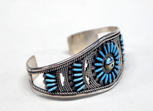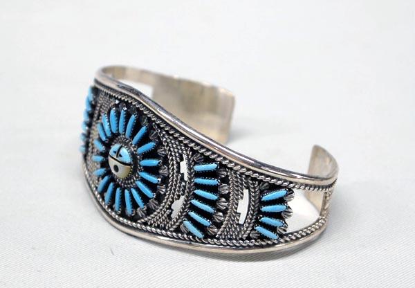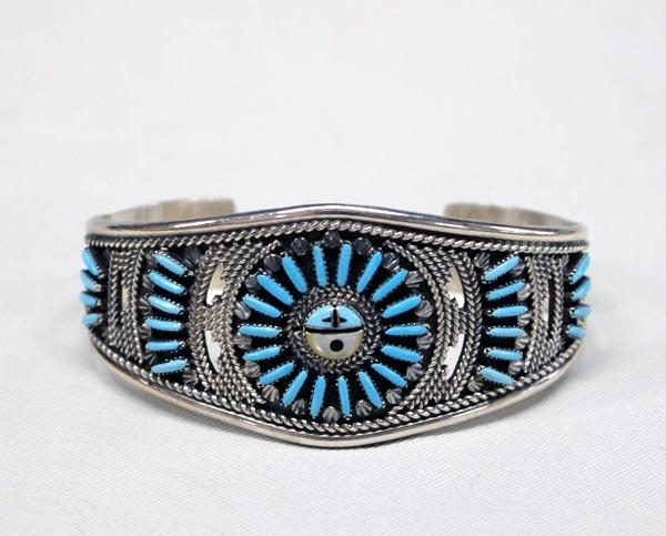 Native American Zuni Silver, Turquoise, MOP, Jet, Needlepoint Bracelet by Harry Mehlican, measures 1.25'' wide and 5.75'' inside. Buyers Pay Actual Shipping and Handling Charges(see terms and conditions for more information).